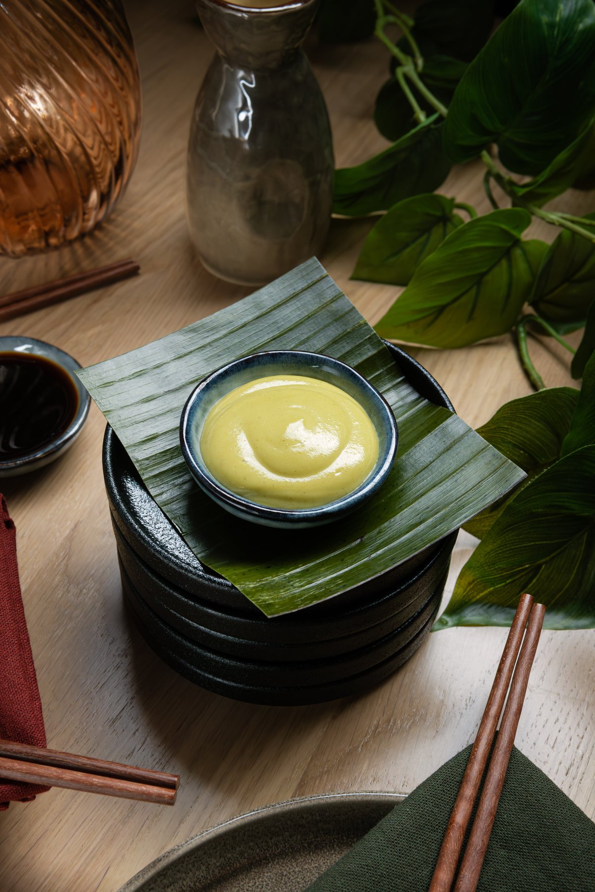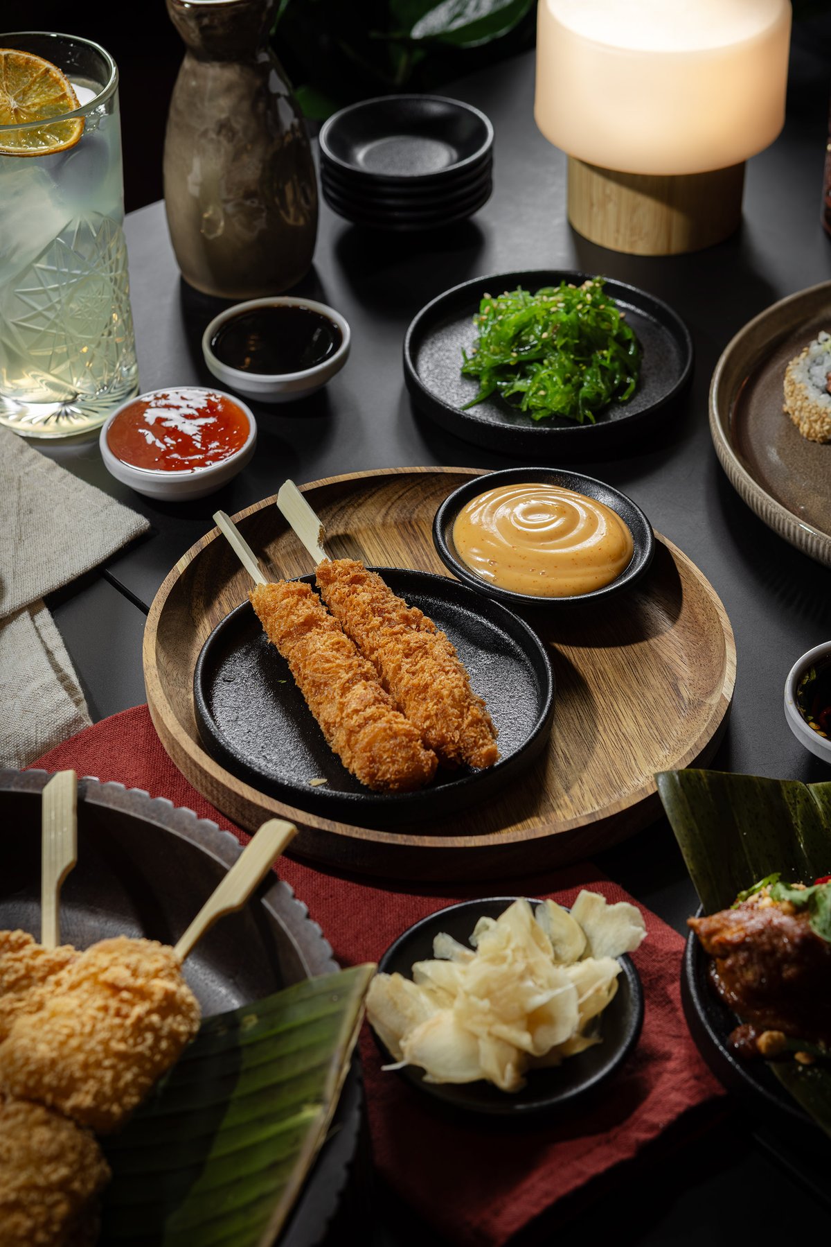 Fritert sushisandwich med grillet sataykylling, vårløk, avokado, hvit sesam og chilimajones Serveres med chilimajo og soyasaus.
