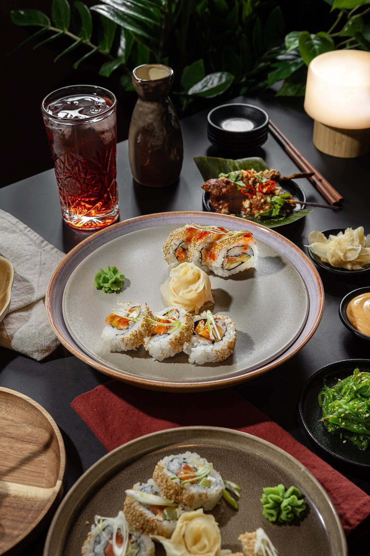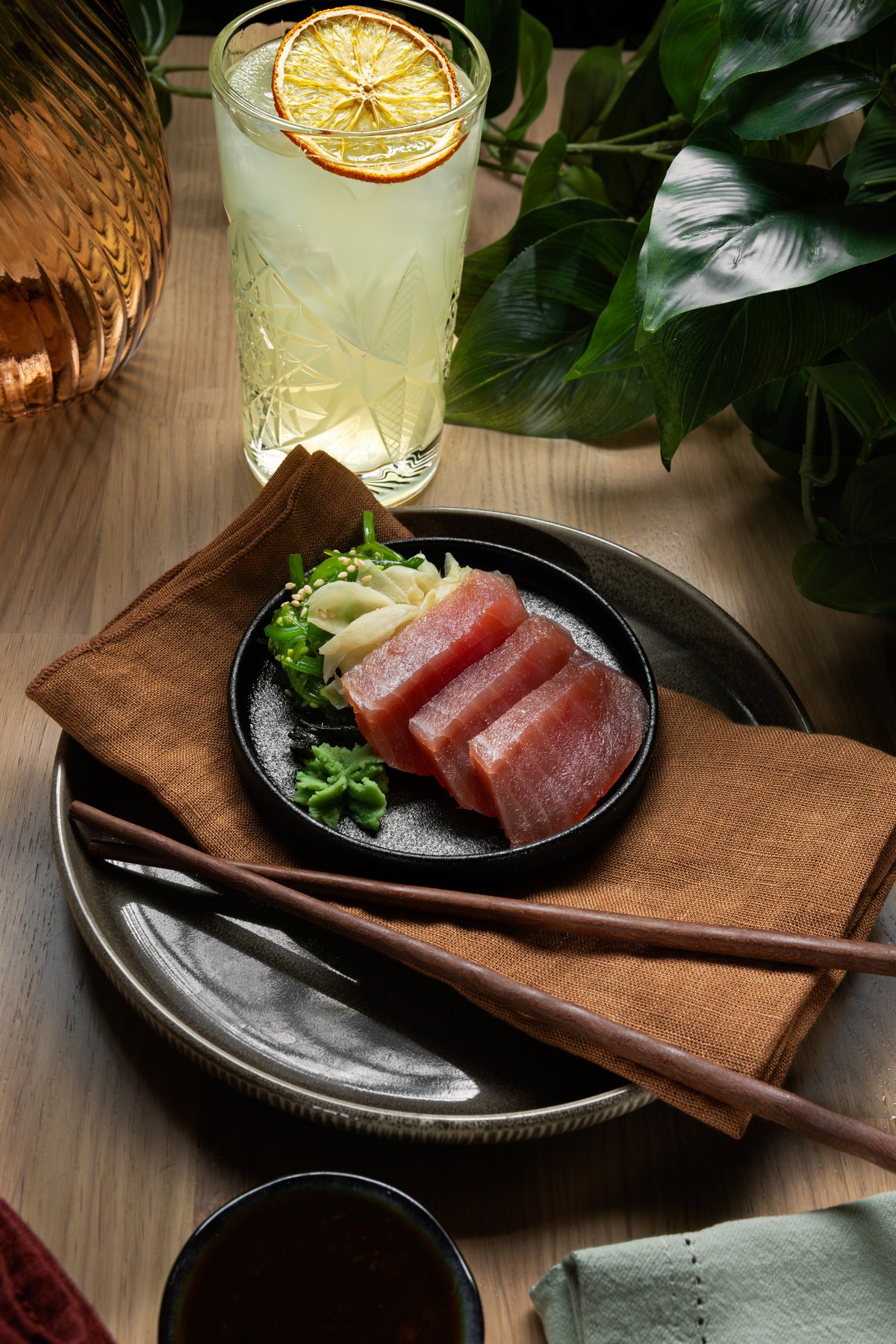 Tunfisk vendt i Sabrura ponzusaus, ris, agurk, mango, reddik, avokado, edamamebønner, gulrot, goma wakame, alfalfa, nori og sesamfrø.