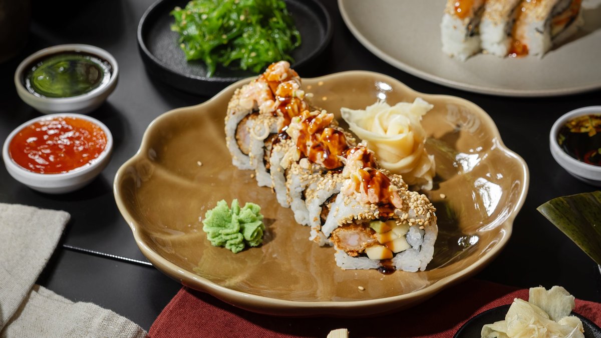Trendretten sushiburrito med tempura scampi, Philadelphia og eple. Toppet med chilimajo, sriracha og teriyakisaus. Kommer med ekstra chilimajo til dipping!