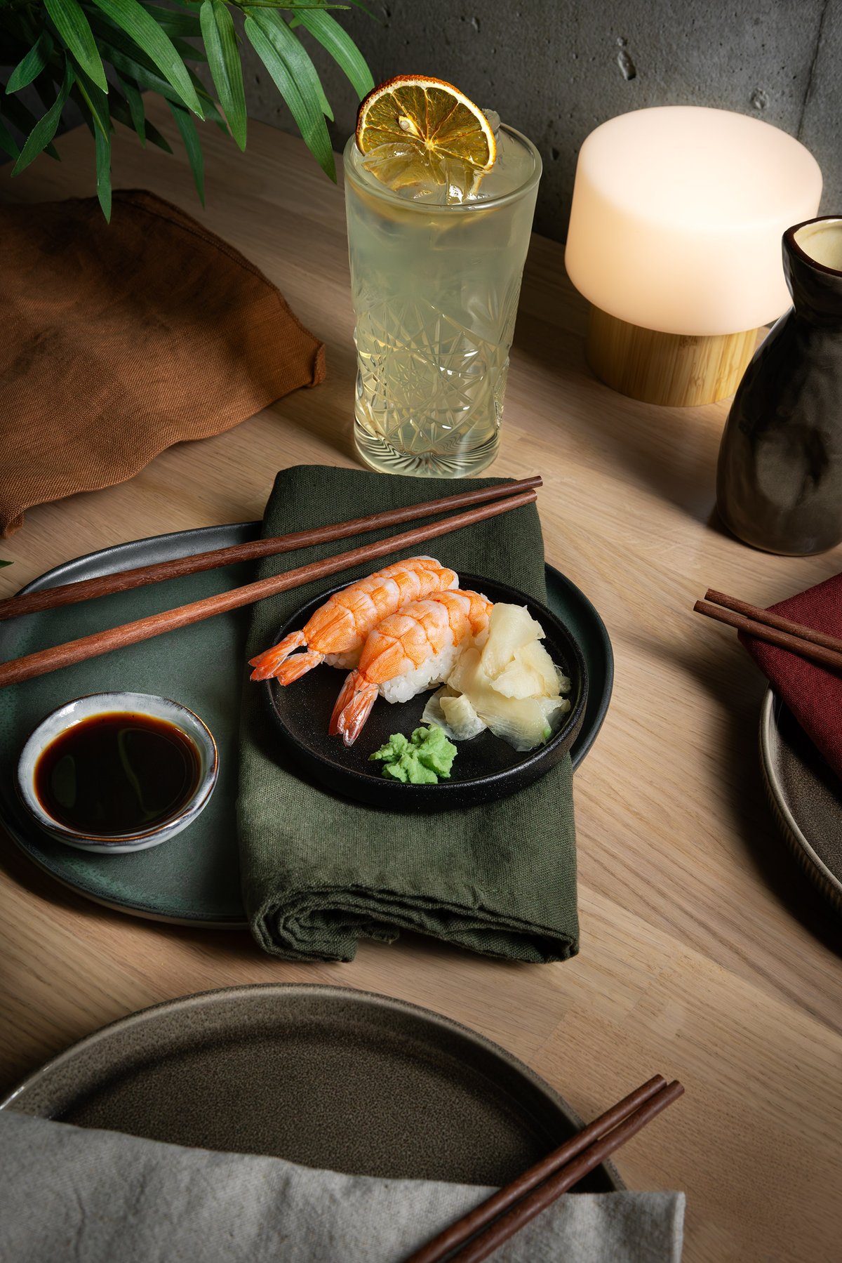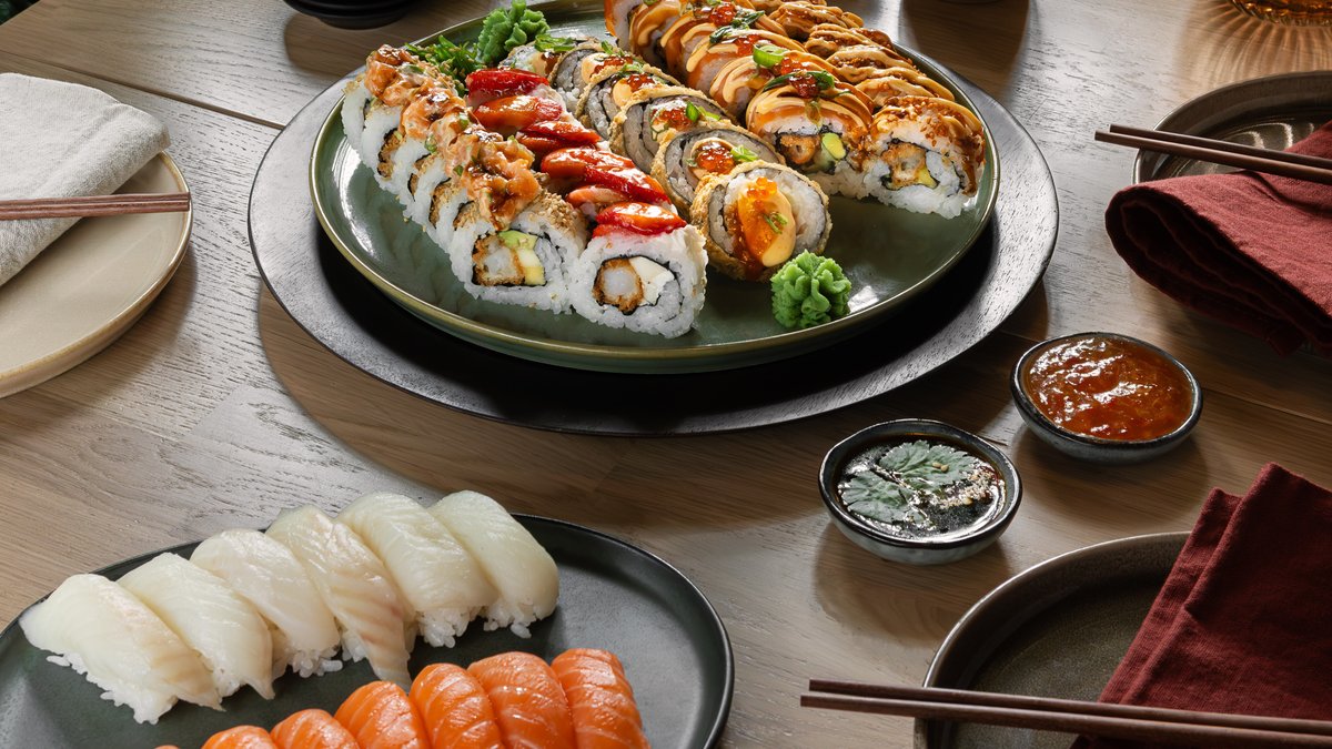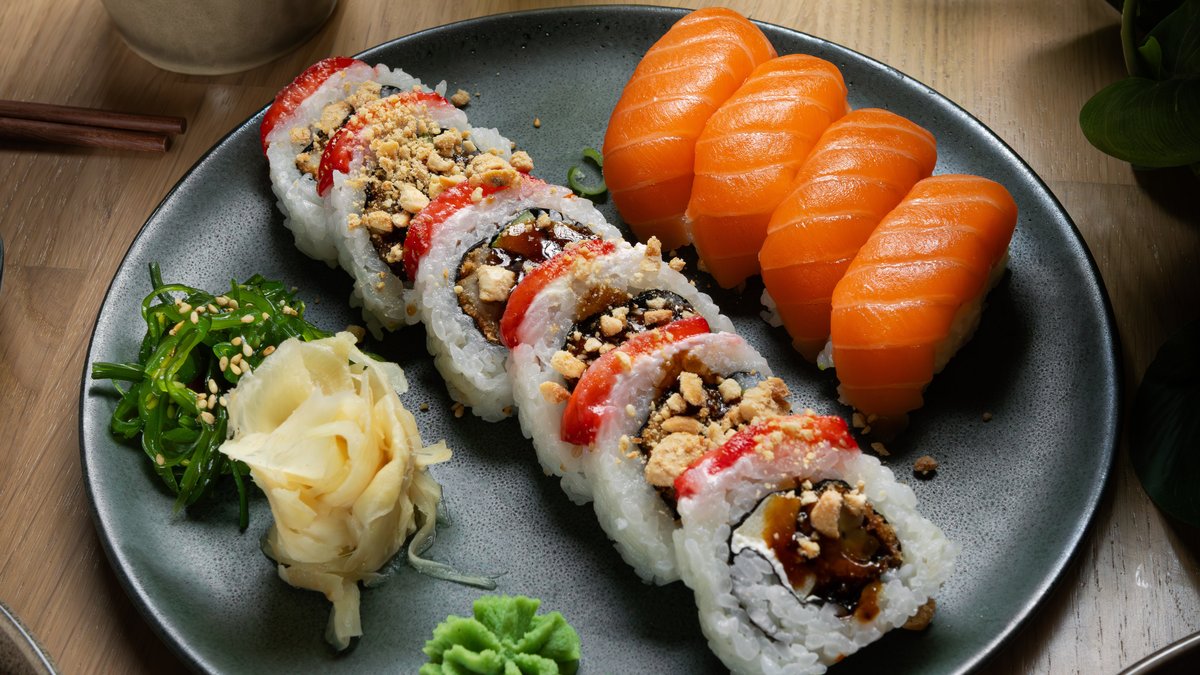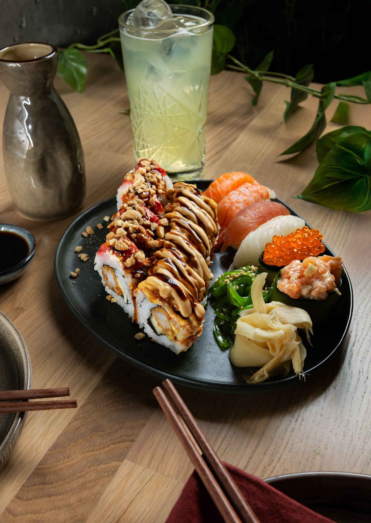 4 biter nigiri av laks, tunfisk, kveite og reke, 2 biter gunkan av lakserogn og laks og 1 stk. valgfri makirull. Serveres med sjøgress, ingefær og wasabi.