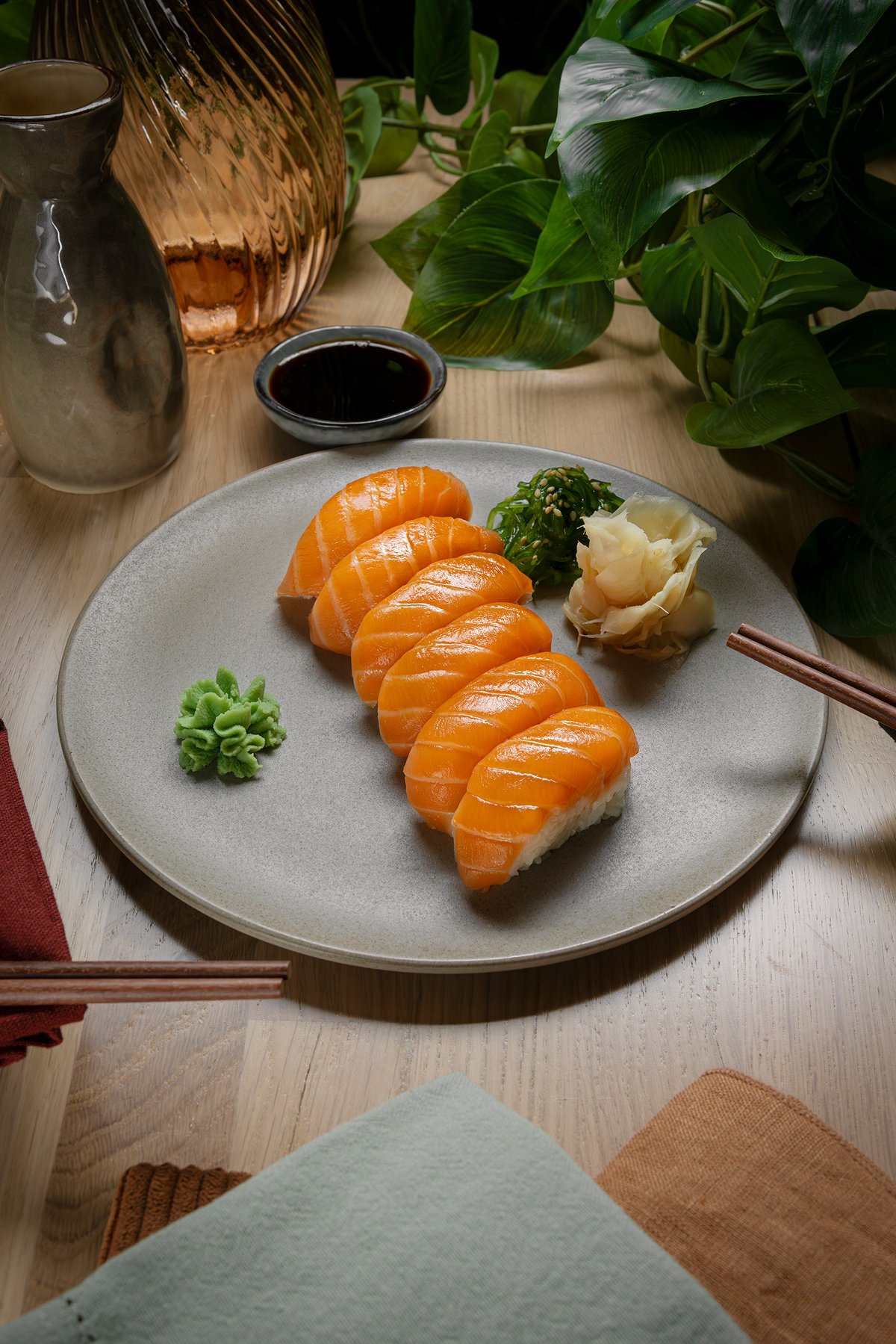 4 biter nigiri laks og en valgfri makirull. Serveres med ingefær og wasabi.