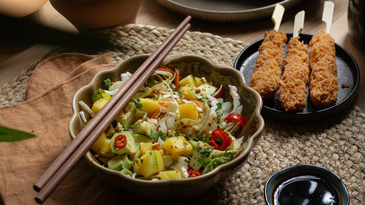 Frisk råkostsalat vendt i sweetchilli-saus med avokado og mango. Toppet med chili, koriander og cashewnøtter.