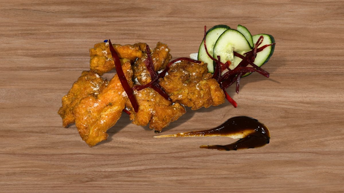 Crispy og gyldenstekte kyllingfritter marinert i aromatiske krydder og belagt med en lett garam-melrøre.