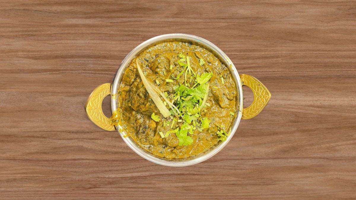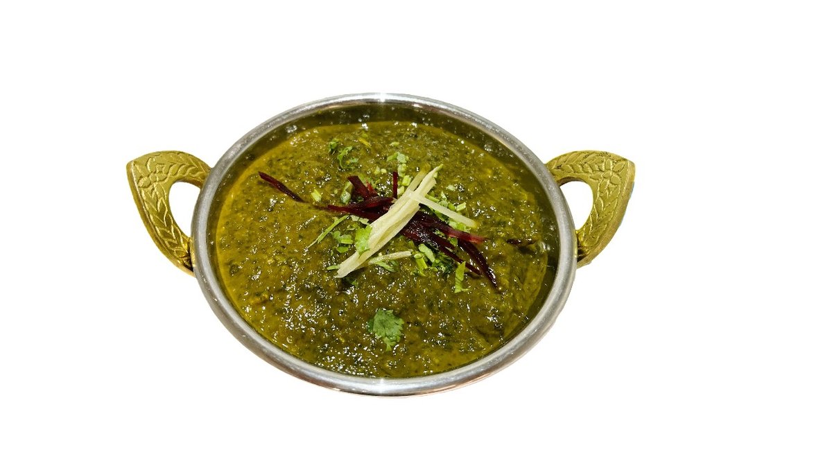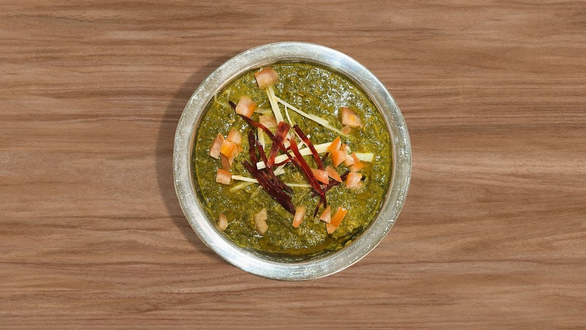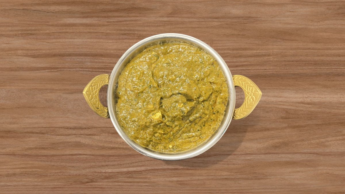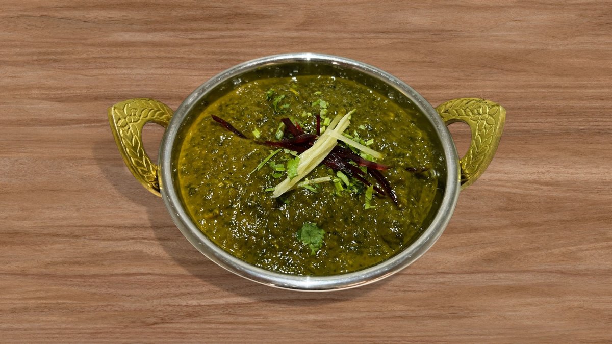 En blanding av grønnsaker tilberedt i en saus av spinat, kokos og aromatiske krydder.