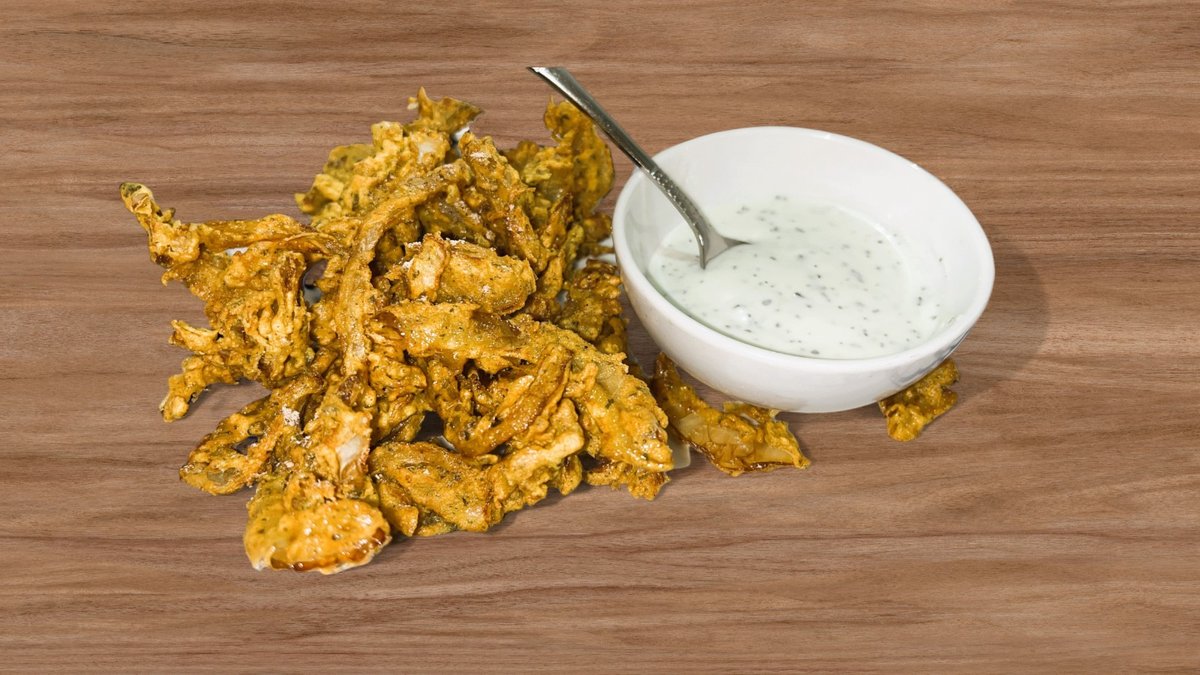 Crispy og gyldenbrune løkfritter frityrstekt til perfeksjon i en krydret garam-melrøre.
