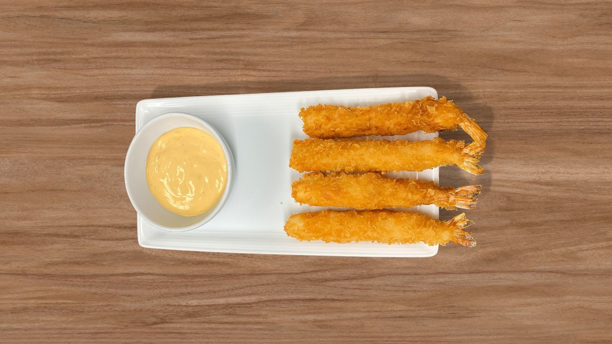 Fire sprøstekte reker belagt i panko (japansk brødsmuler) med en skvett krydret majones.