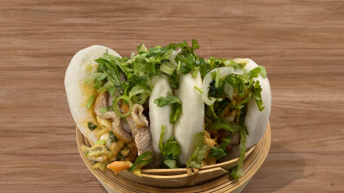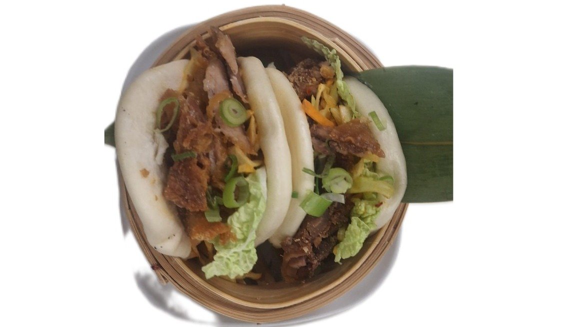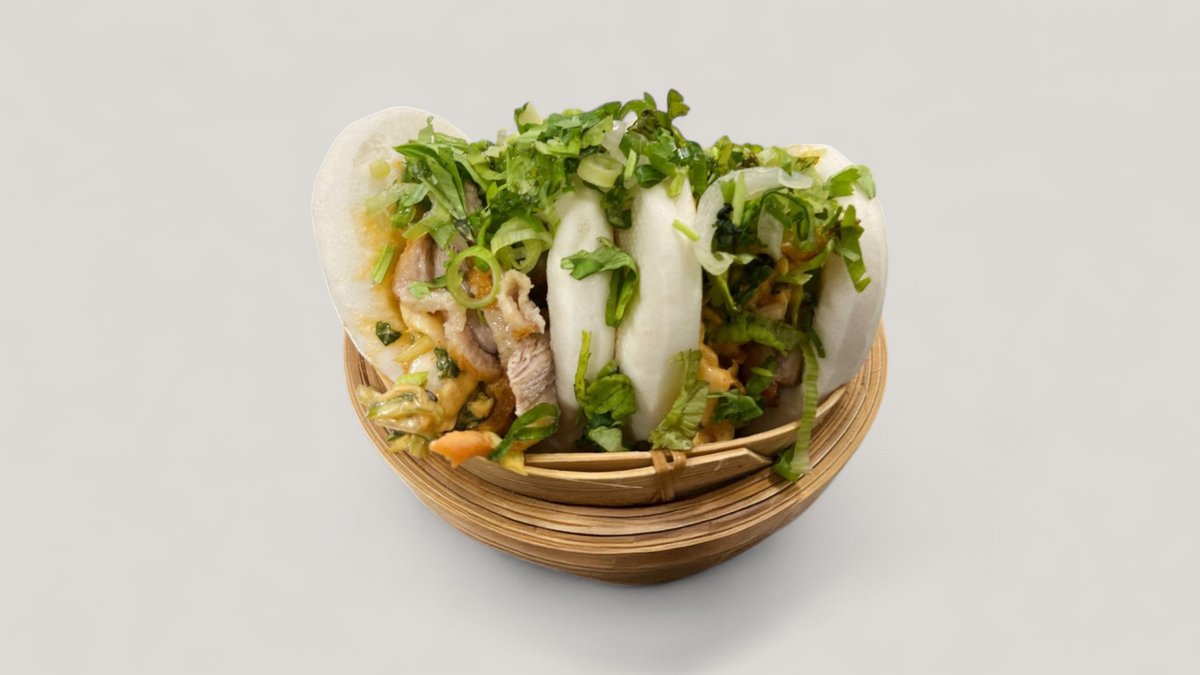 To myke, luftige kinesiske dampede boller fylt med sprø and fersk kimchi-slaw og sprø stekt løk, toppet med krydret majones.