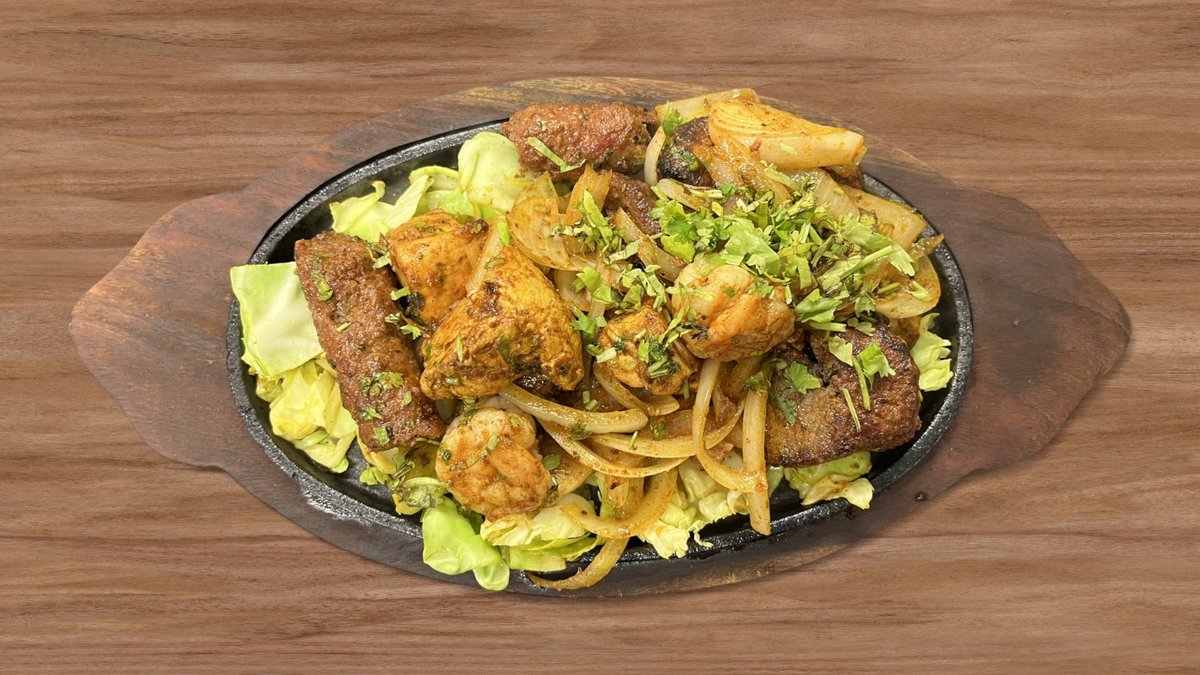 Et sydende fat med tandooriretter inkludert lammetikka, kyllingtikka, seekh kebab og reker tikka.