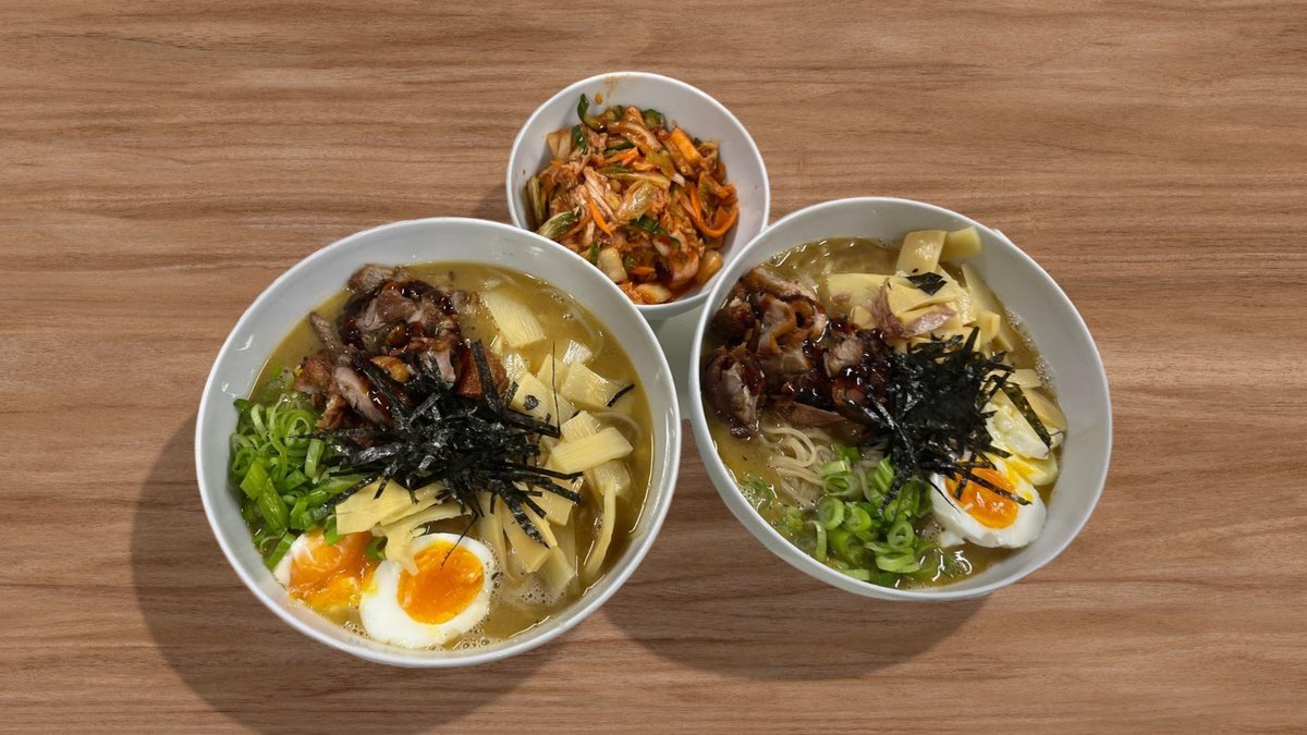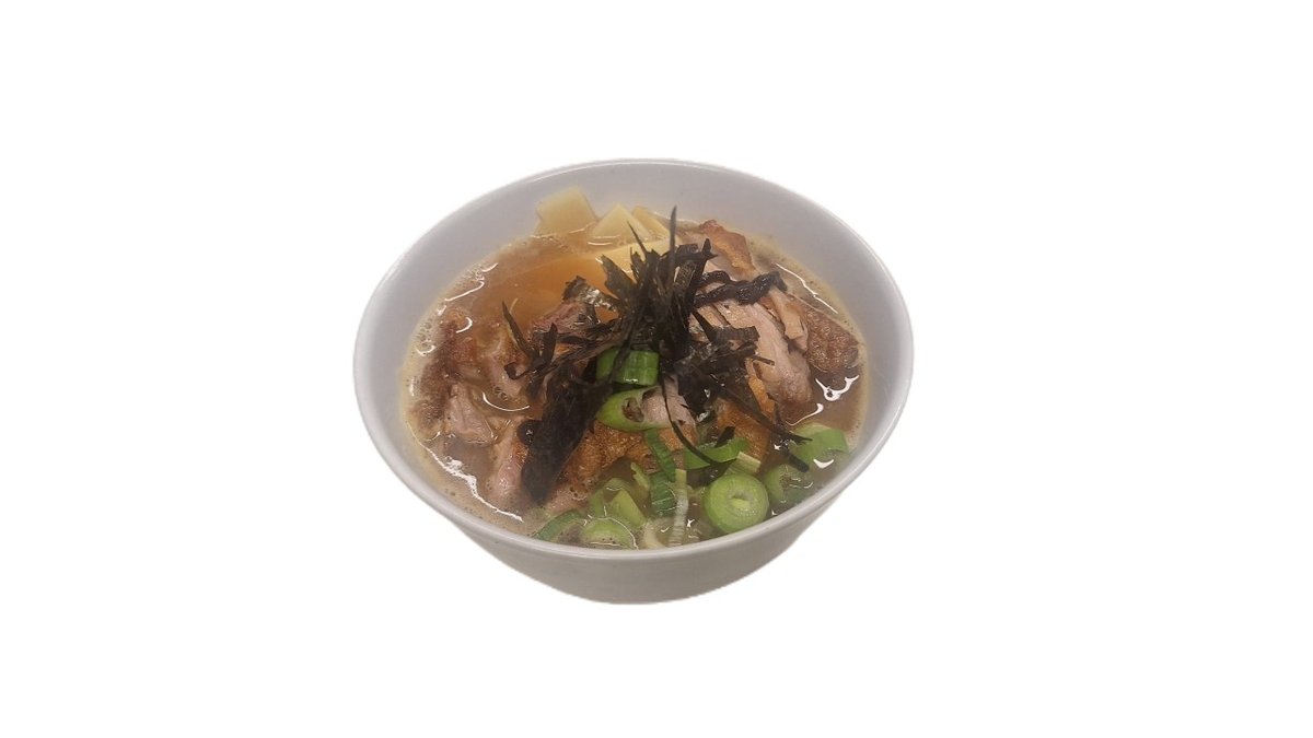 En kylling- og soyasausbasert suppe i japansk stil med sprø and, vårløk, bambusskudd, et bløtkokt egg, hoisinsaus, kimchi og sesamfrø, servert med ramennudler.