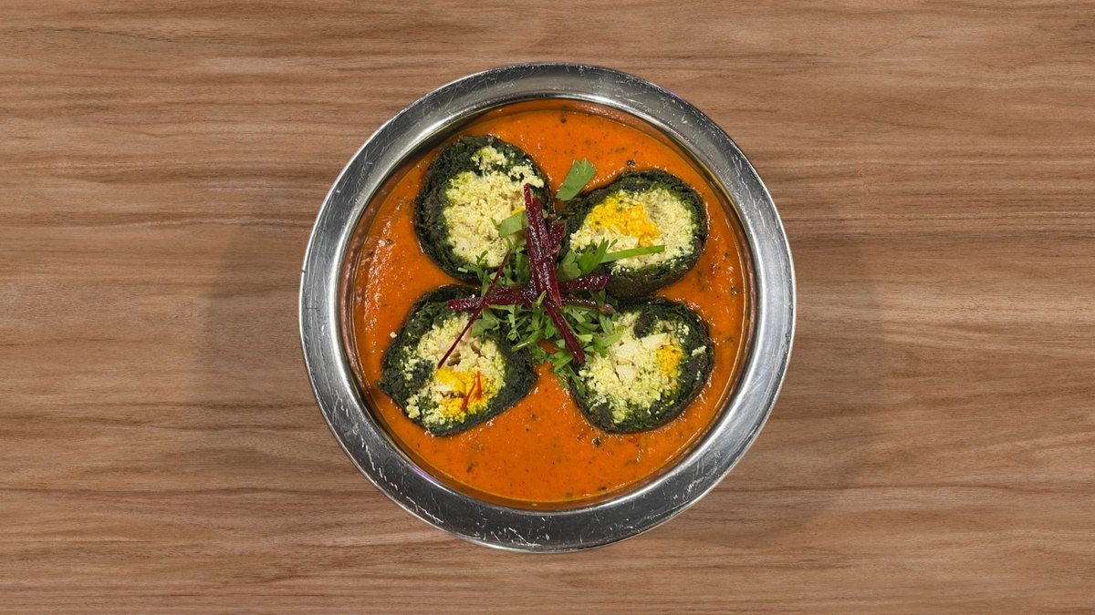 Dyp-stekte spinatkuler fylt med tofu (bønneost) i en syrlig og krydret tomat og kremet saus.