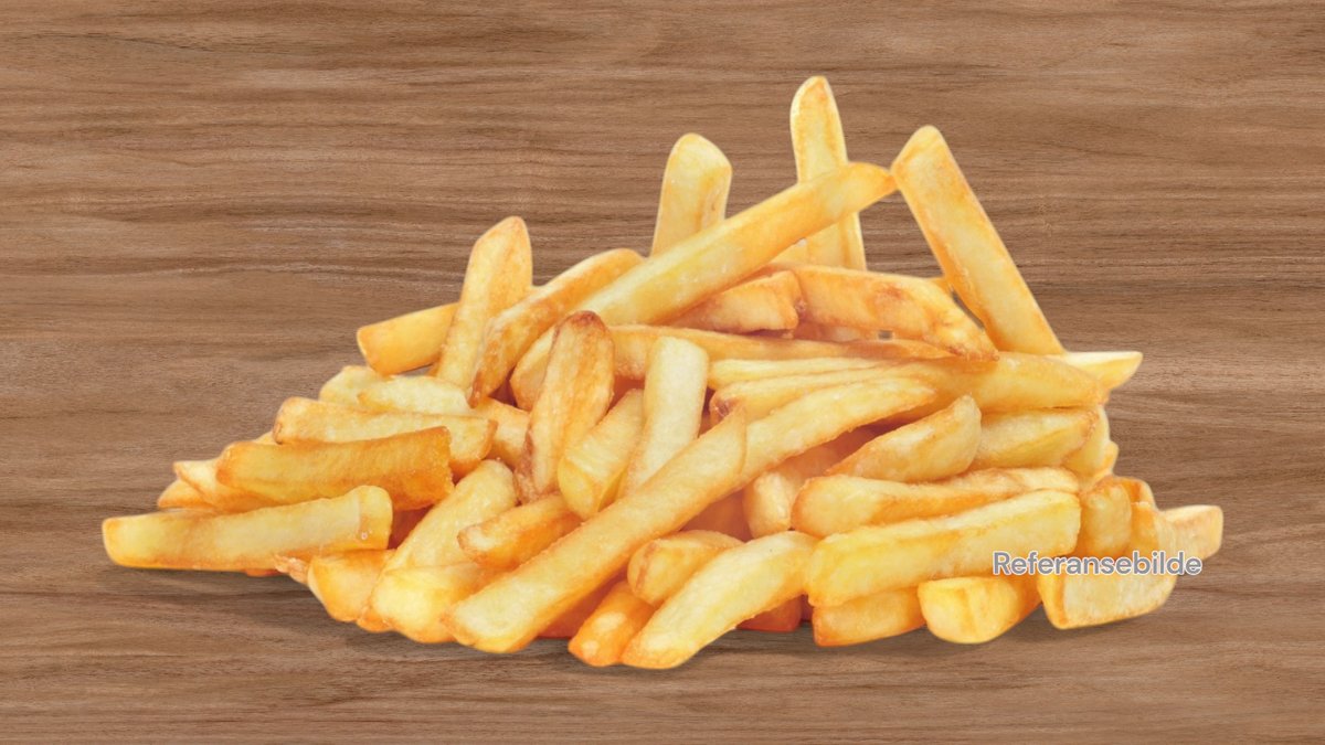 Klassiske gylne pommes frites, lett krydret og servert med ketchup.