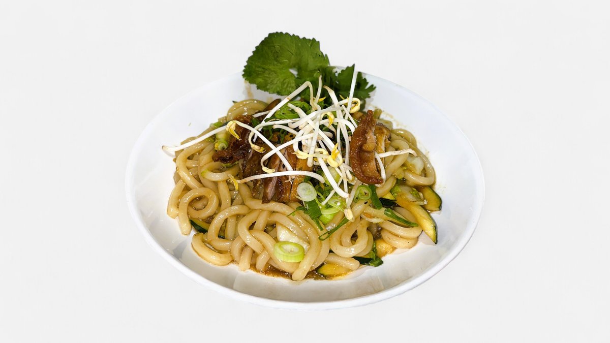 NUDLER - Yaki udon er japansk rett. Stekte bokhvetenudler med sprøstekt and, wokede grønnsaker og teriyakisaus.