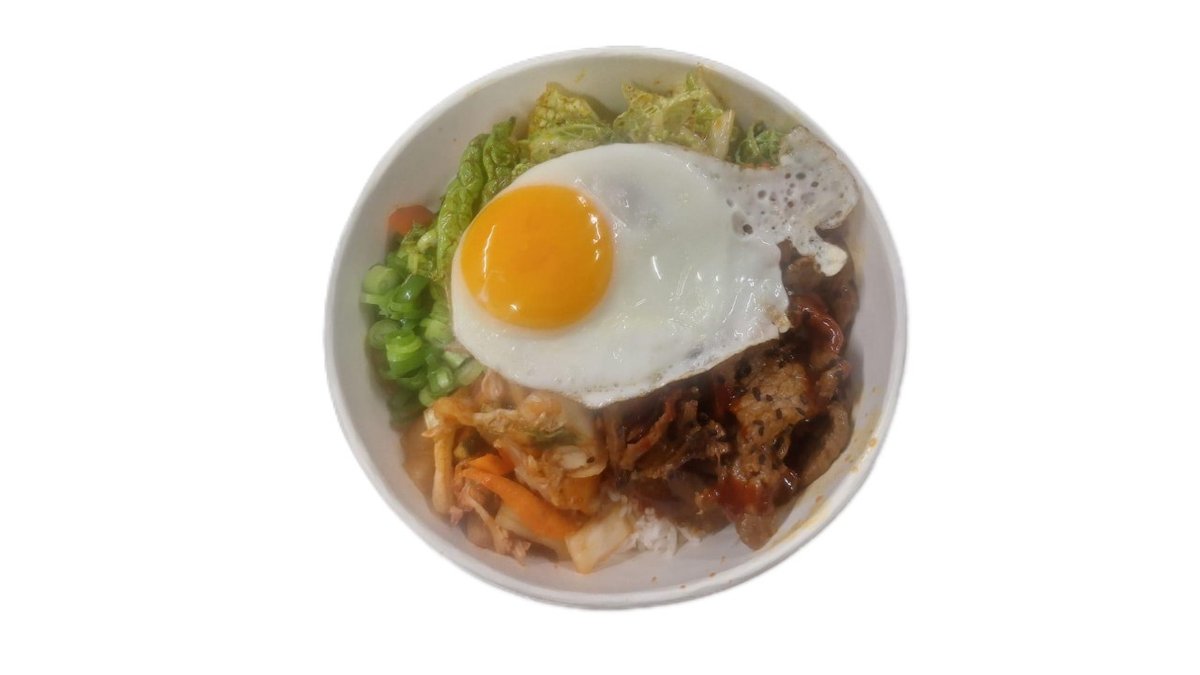 HOVEDRETTER - En livlig koreansk risbolle med marinert mørbrad i krydret gochujang-saus, sauterte gulrøtter, vannkastanjer, sprø agurk, syrlig kimchi og et perfekt stekt egg.