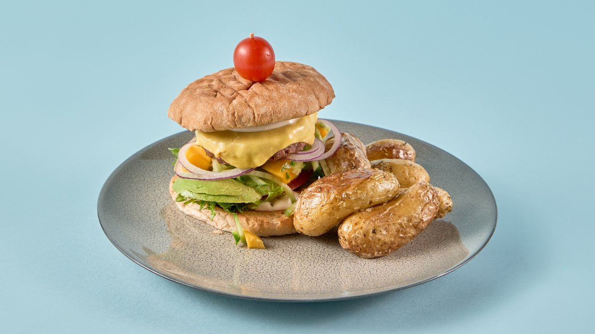 Vegansk burger med bifftomat, avokado, rødløk, mango, crispy salat, vegansk ost, sweet chilimajones & saltbakte poteter