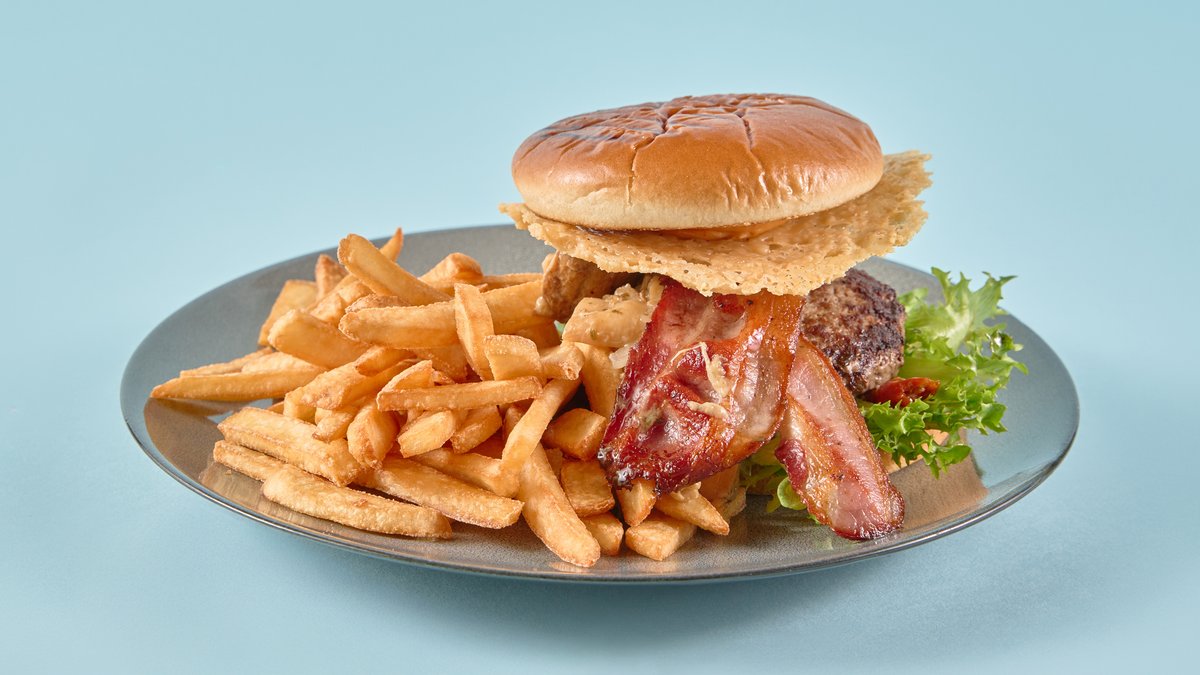 Havariets burger med honeymustard dressing, parmesan, cheddar, bacon, soltørket cherrytomat, agurk, rødløkskompott & fries