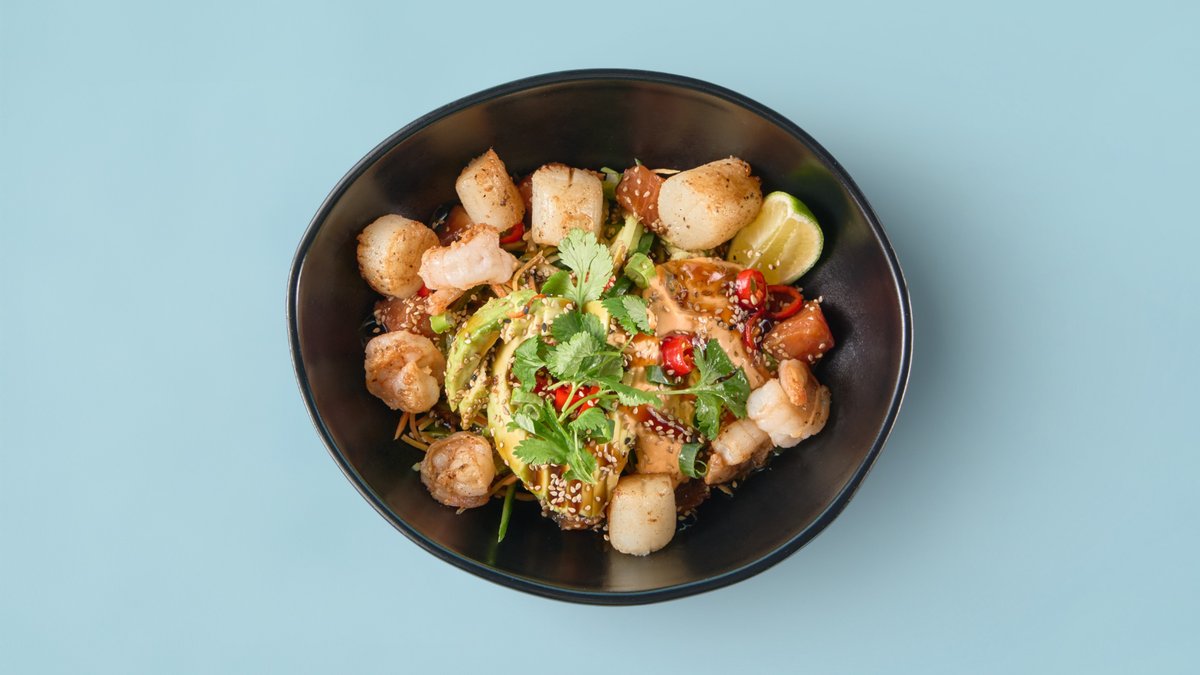 Asiatisk skalldyrsalat med scampi, kamskjell, frøya laks, agurk, avocado, sukkererter, vårløk, gulrot, koriander, chili, sesamfrø, teriyakisaus & chilimajones