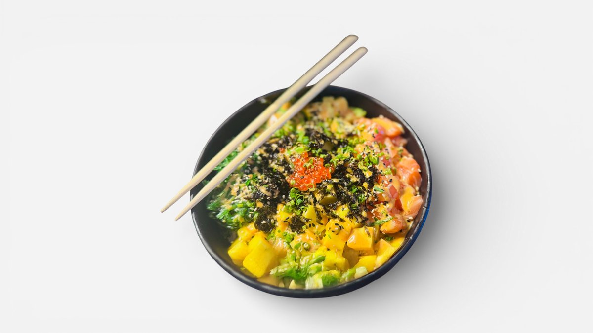 Laks i ponzu Saus,chili, vårløk, avokado, laks rogn, sjøgresssalat, mango, sushiris, sesamfrø.