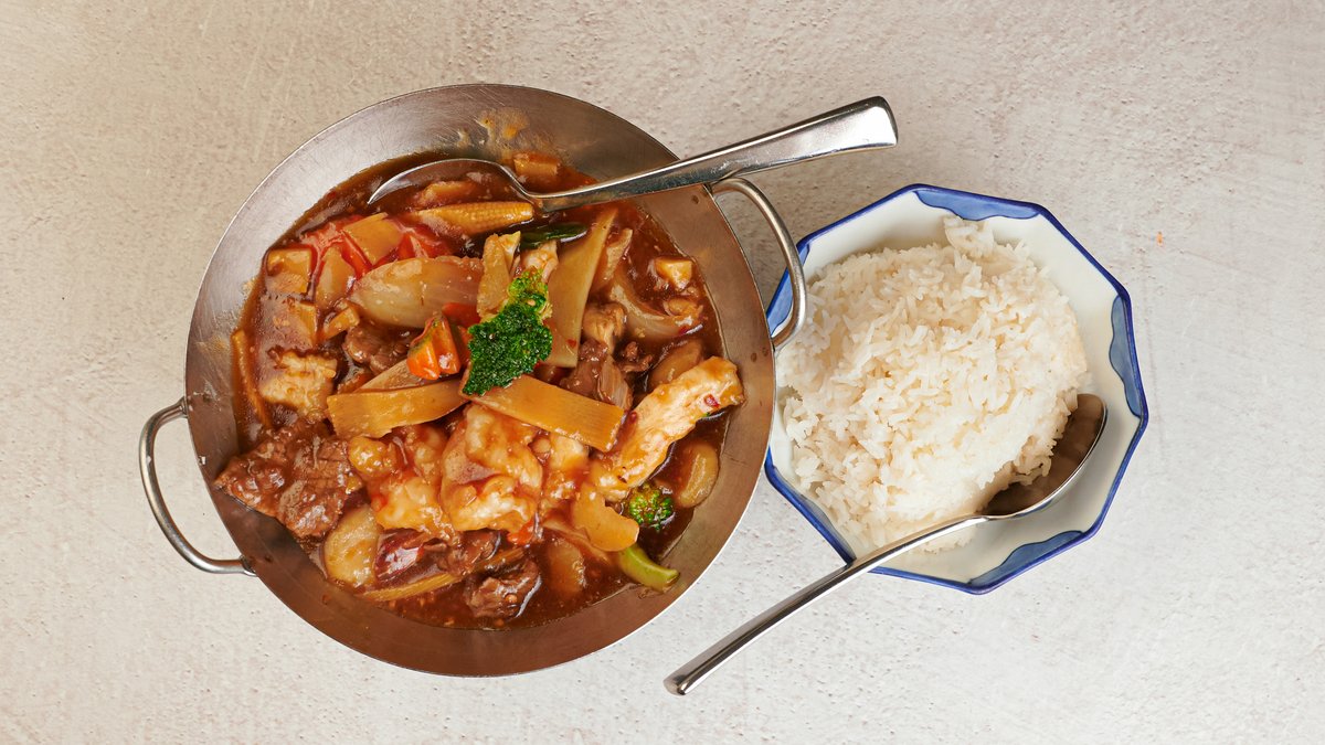 Ristet biffkjøtt kylling & svinekjøtt m/ hvitlek ingefær i klassisk vin-eddiksaus, servert m/ jern-wok form
