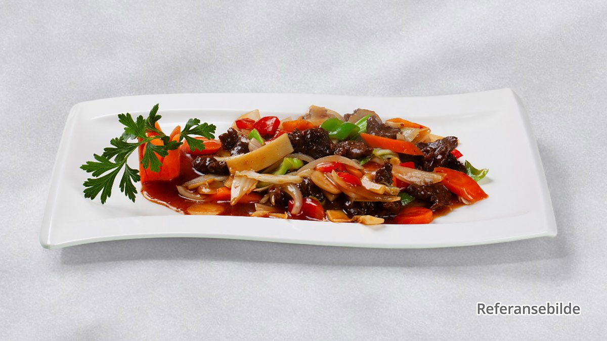 Krydret med ingefær i klassisk hoi-sin estersaus. Servert med jern-wok form.