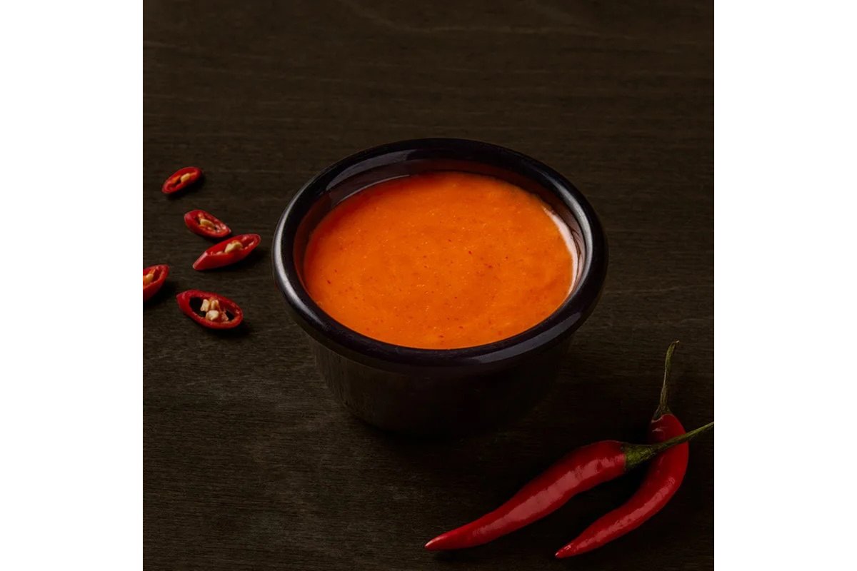 BBQ-marinert kylling, paprika, jalapeños og ekstra BBQ-saus. Toppes med pico de gallo og hakket bladpersille.