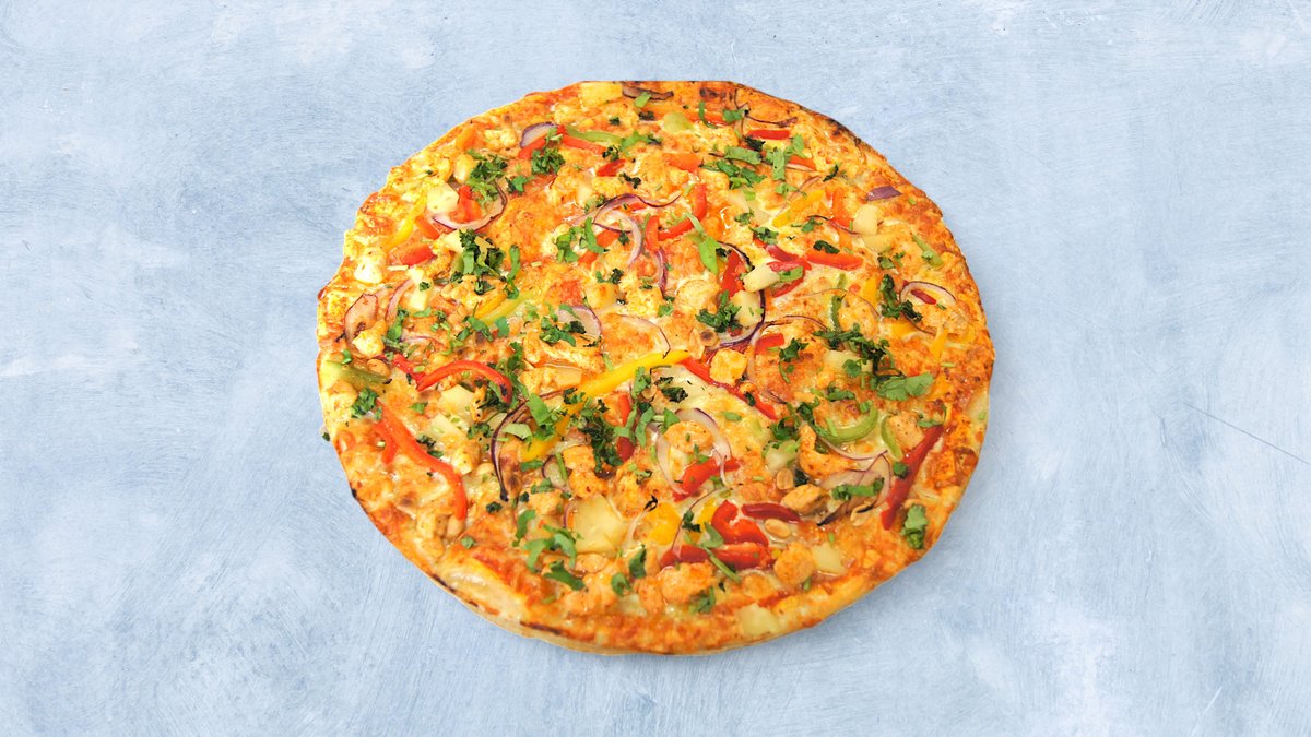 Pizza med sataymarinert kylling, paprika, rødløk, ananas, peanøtter og fersk koriander.