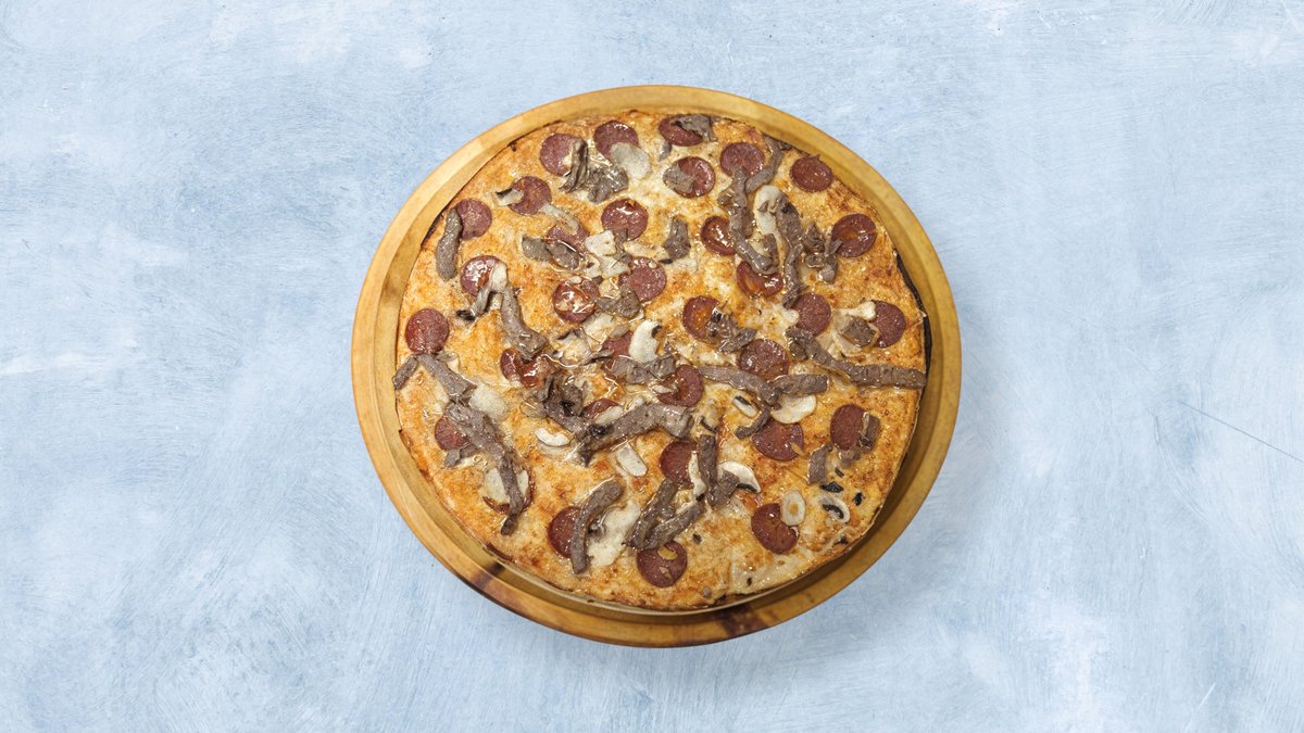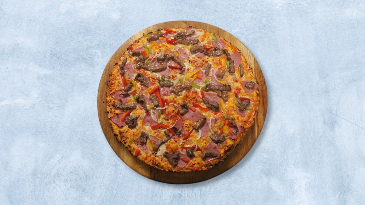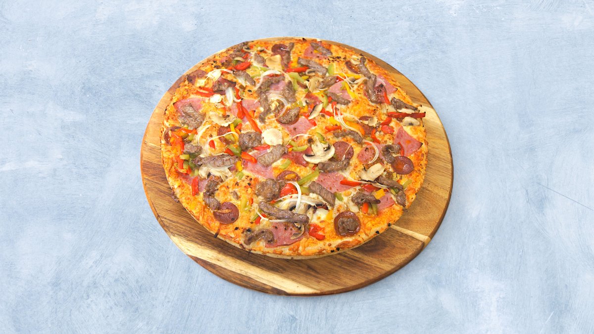 Pizza med skinke, marinert biff, pepperoni, løk, paprika og fersk champignon.