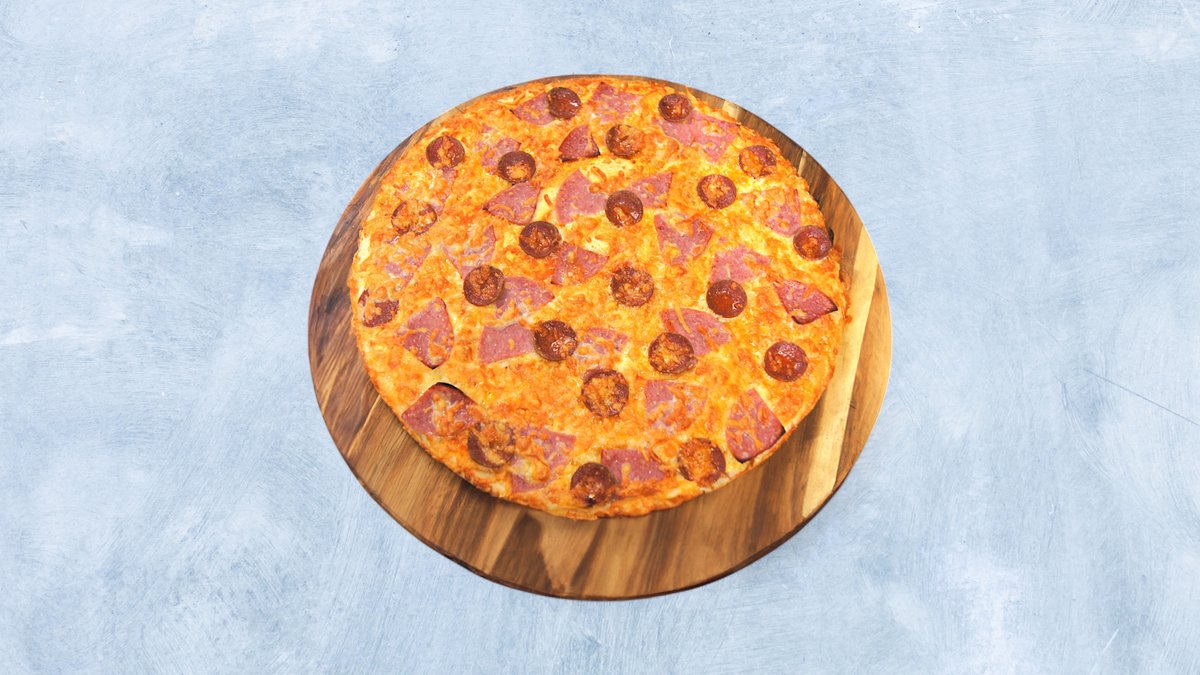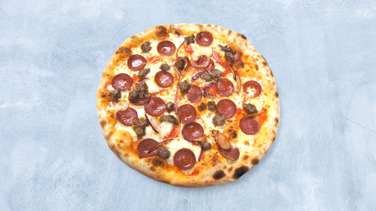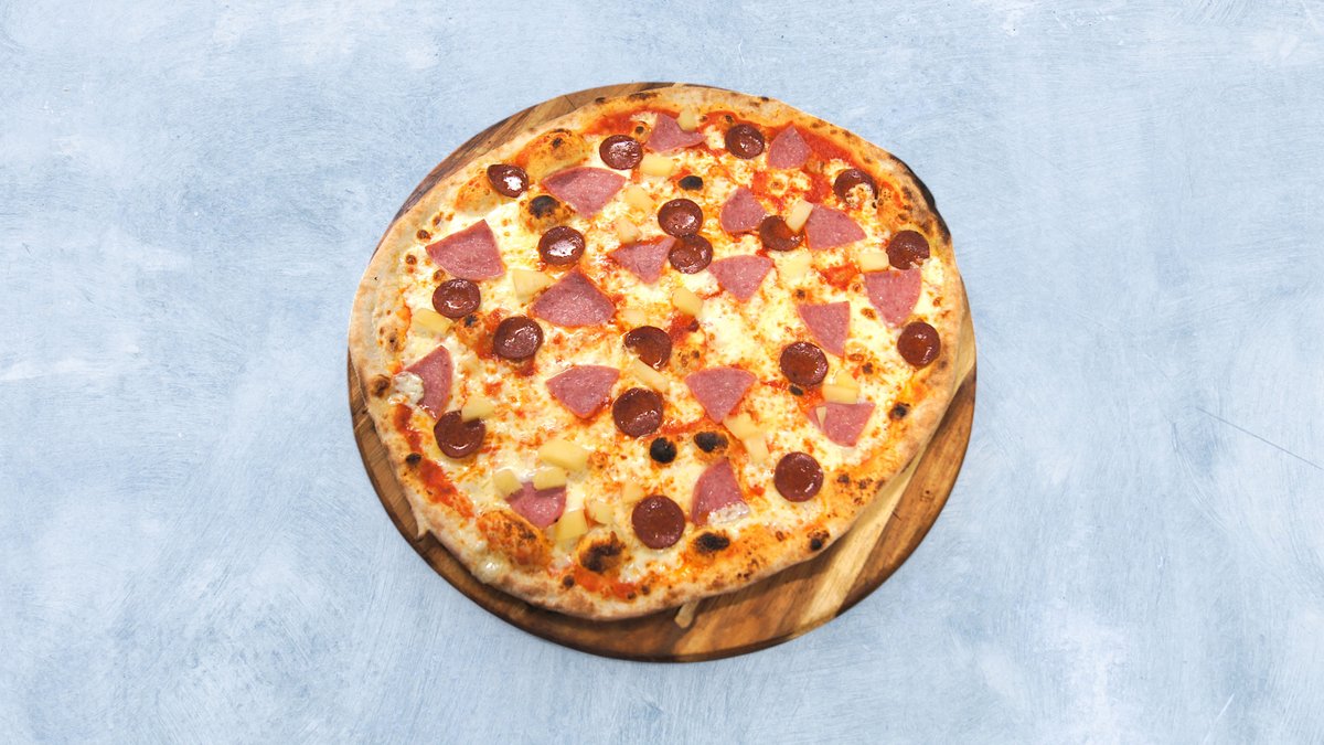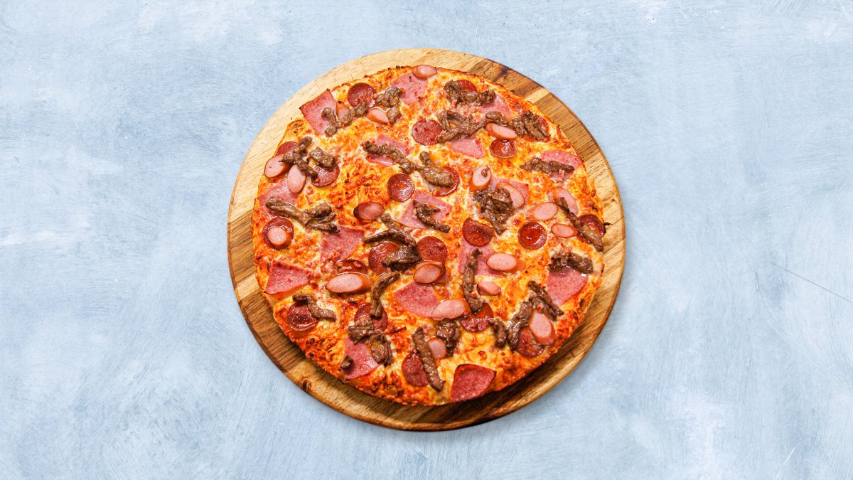 Pizza med skinke, bacon, pepperoni, biff og pølse.