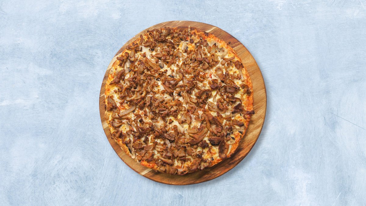 Pizza med løk, biff, bacon, ekte kebabkjøtt, fersk champignon og paprika. Velg med eller uten oliven.