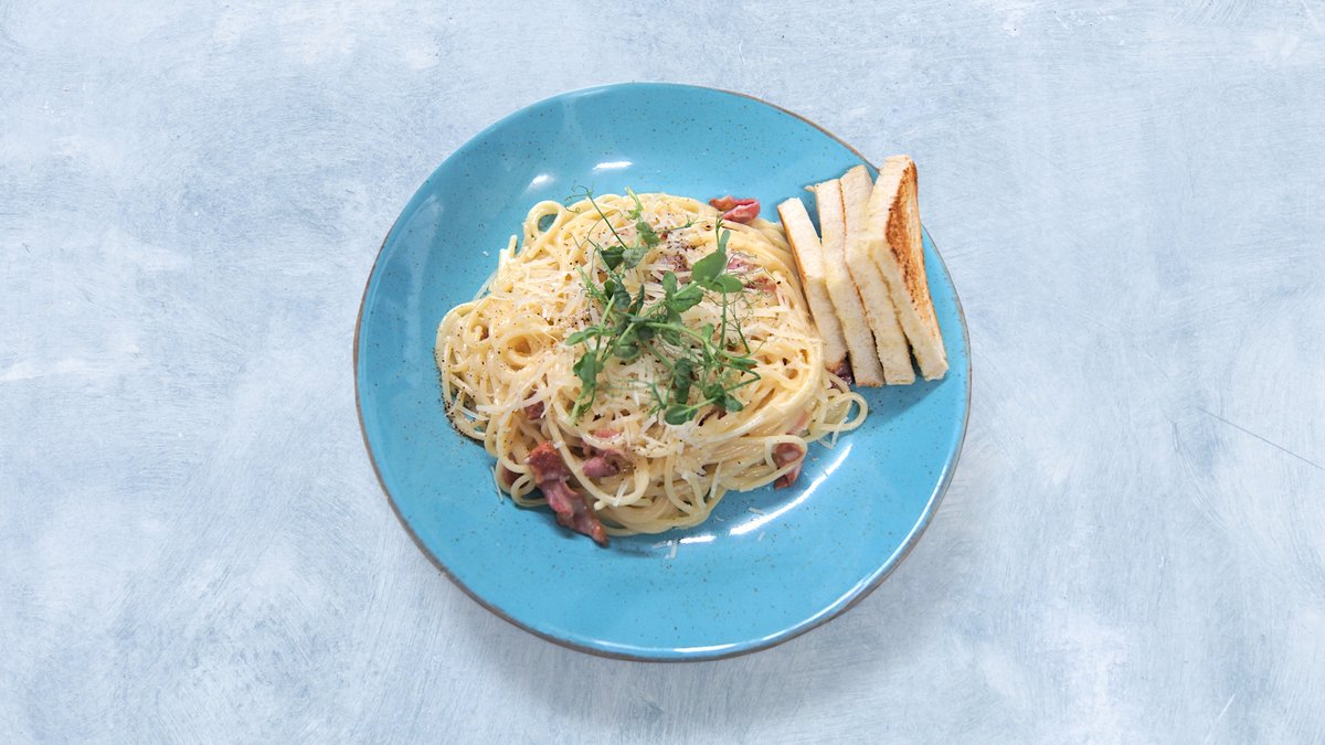Pasta med champignon, paprika, fløtesaus og parmesanost.