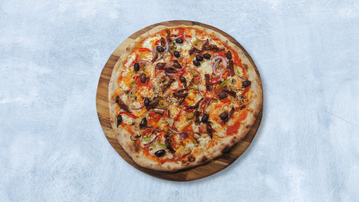 Pizza med tomatsaus, mozzarella, champignon, løk, paprika, soltørket tomat og oliven.