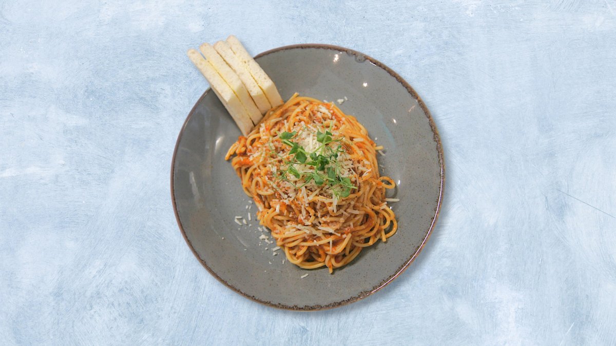 Pasta med kjøtt-tomatsaus og parmesanost.