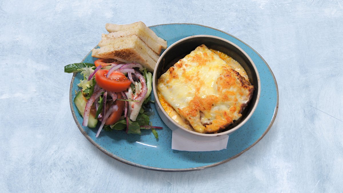 Husets lasagne med bachamelsaus, kjøttsaus og salat.