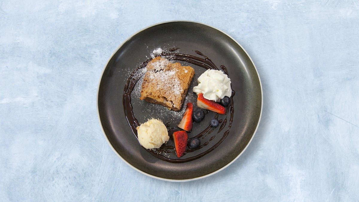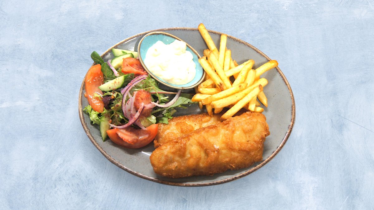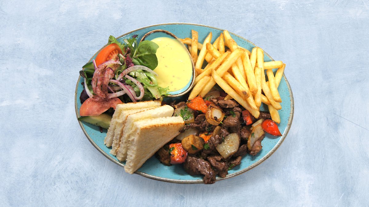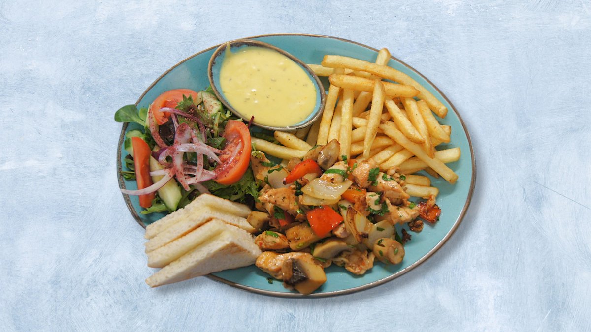 Stekt, marinert kylling med bearnaise, løk, sopp, paprika, brød, salat og pommes frites. Serveres med hvitløksbrød og hvitløksaus.