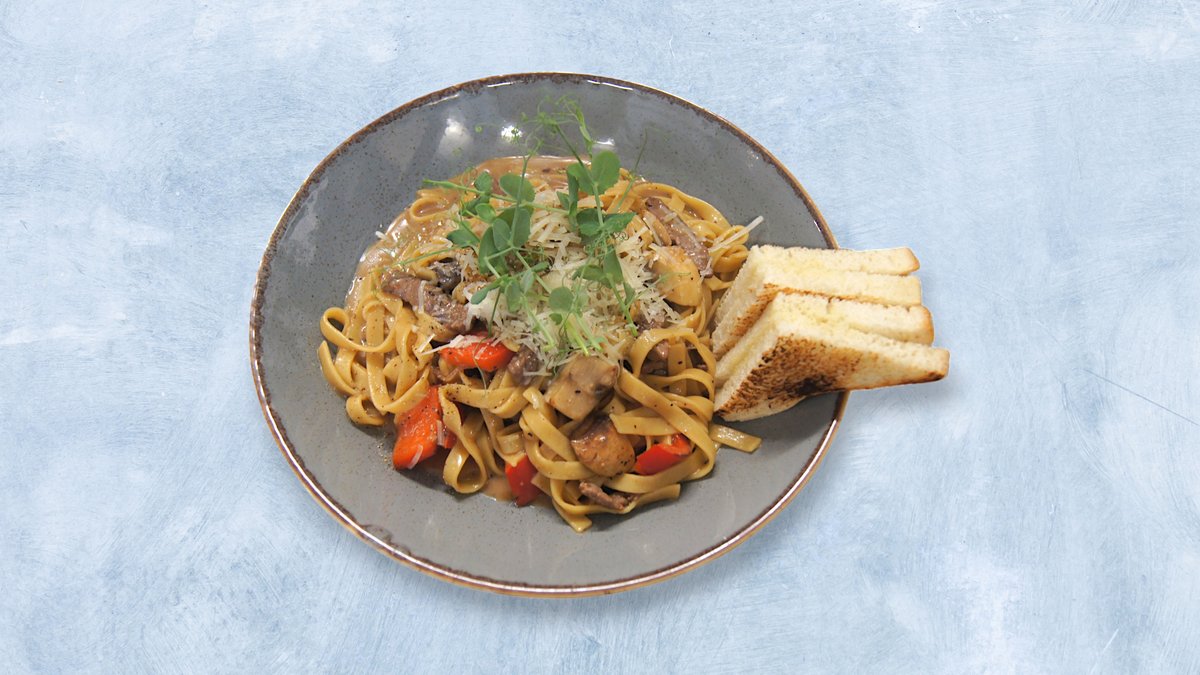 Pasta med biff, champignon og paprika med kremet peppersaus.