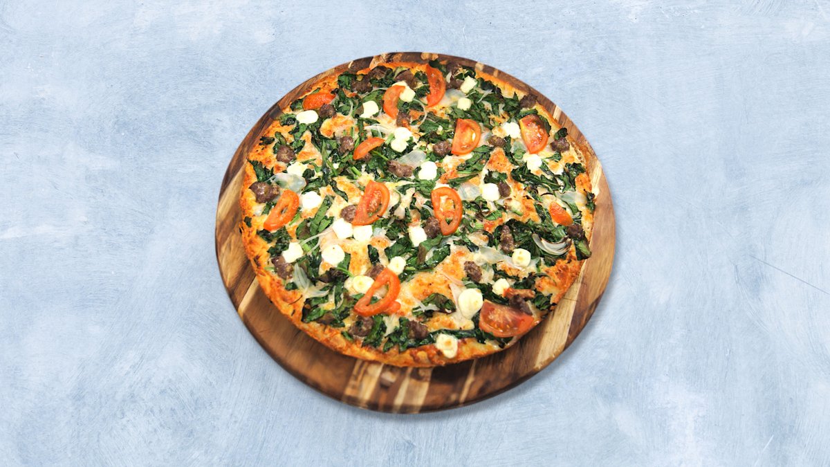 Pizza med mozzarella, kylling, spinat, fetaost, oliven og hvitløk.