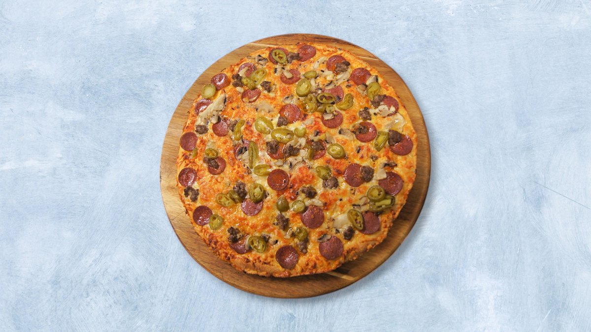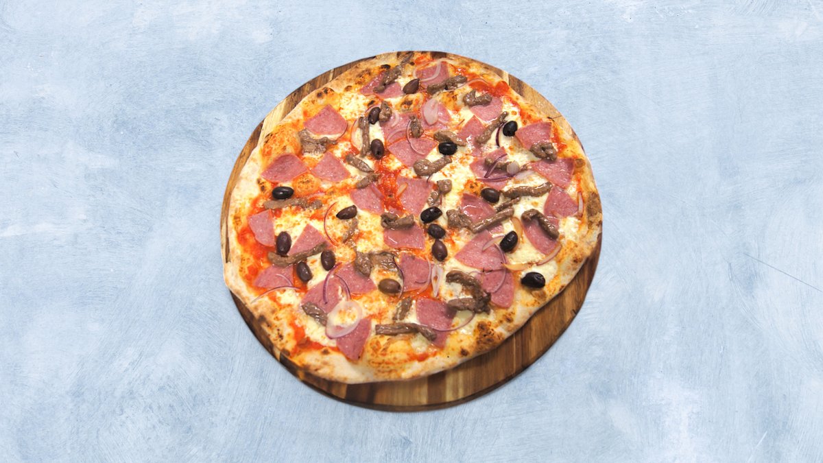 Pizza med marinert biffkjøtt, pepperoni, kjøttdeig, skinke, salami, løk, paprika, fersk champignon og ost. Velg med eller uten oliven.