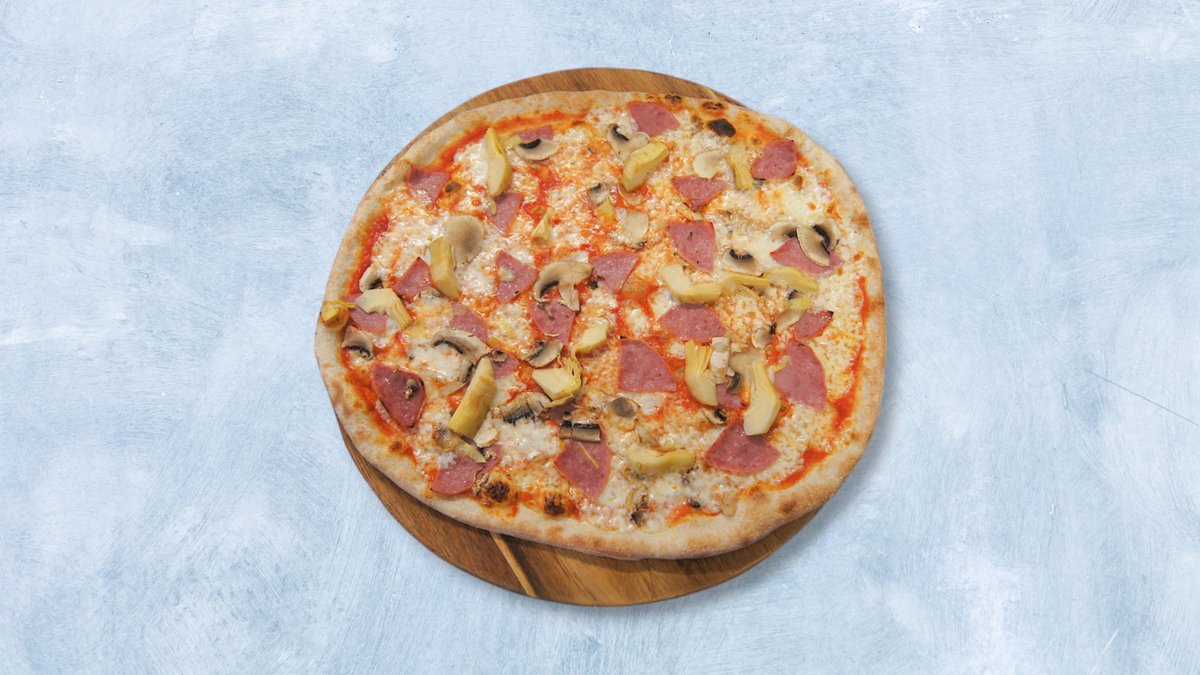 Pizza med tomatsaus, mozzarella, skinke, artisjokk og champignon.