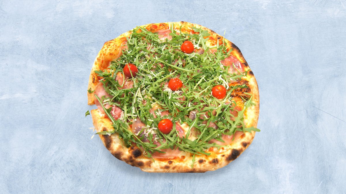 Pizza med tomatsaus, mozzarella, parmaskinke, cherrytomat, ruccolasalat og parmesanost.