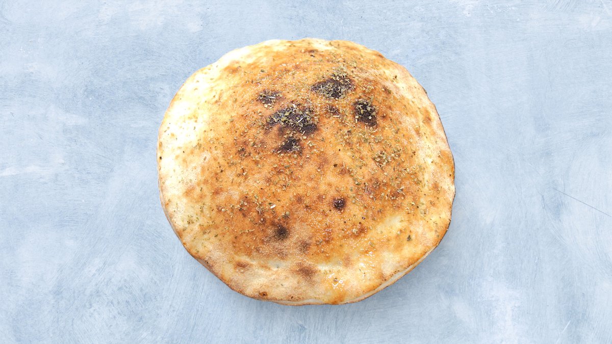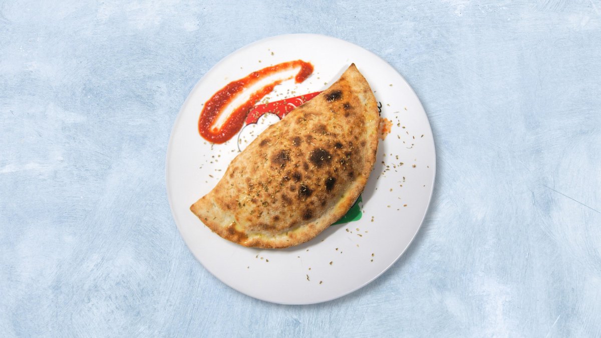 Innbakt pizza med valg mellom biff, kebabkjøtt eller kylling. Med løk og tomatsaus eller hvit saus.
