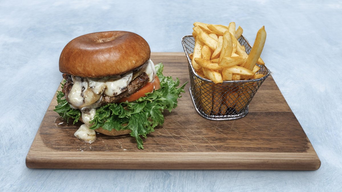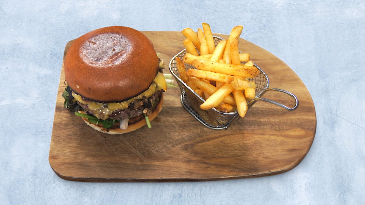 Hamburger med bacon, karamellisert løk, salat, blåmuggostdressing og pommes frites.