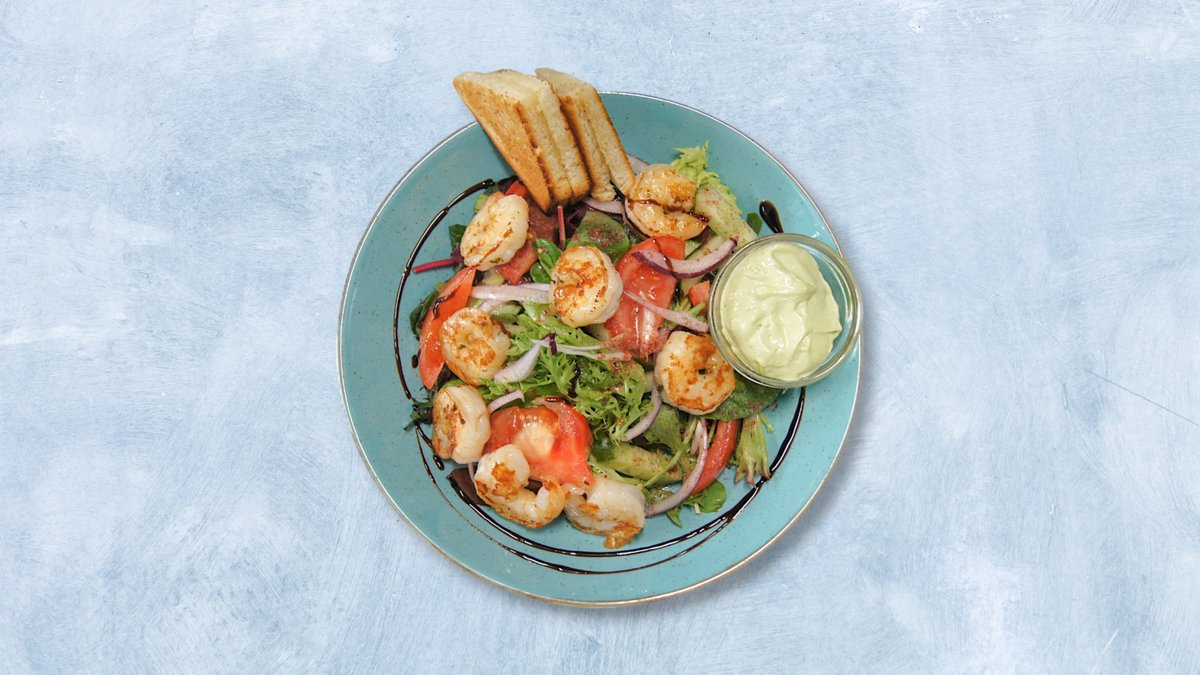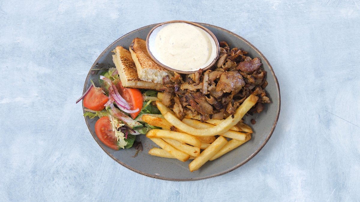 Kebabkjøtt med husets salat, hvitløksdressing og pommes frites. Serveres med hvitløksbrød og hvitløksaus.