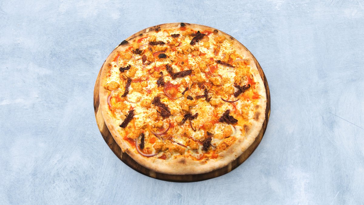 Pizza med tomatsaus, mozzarella, kylling, rød løk, peanøtter, soltørket tomat og curry.