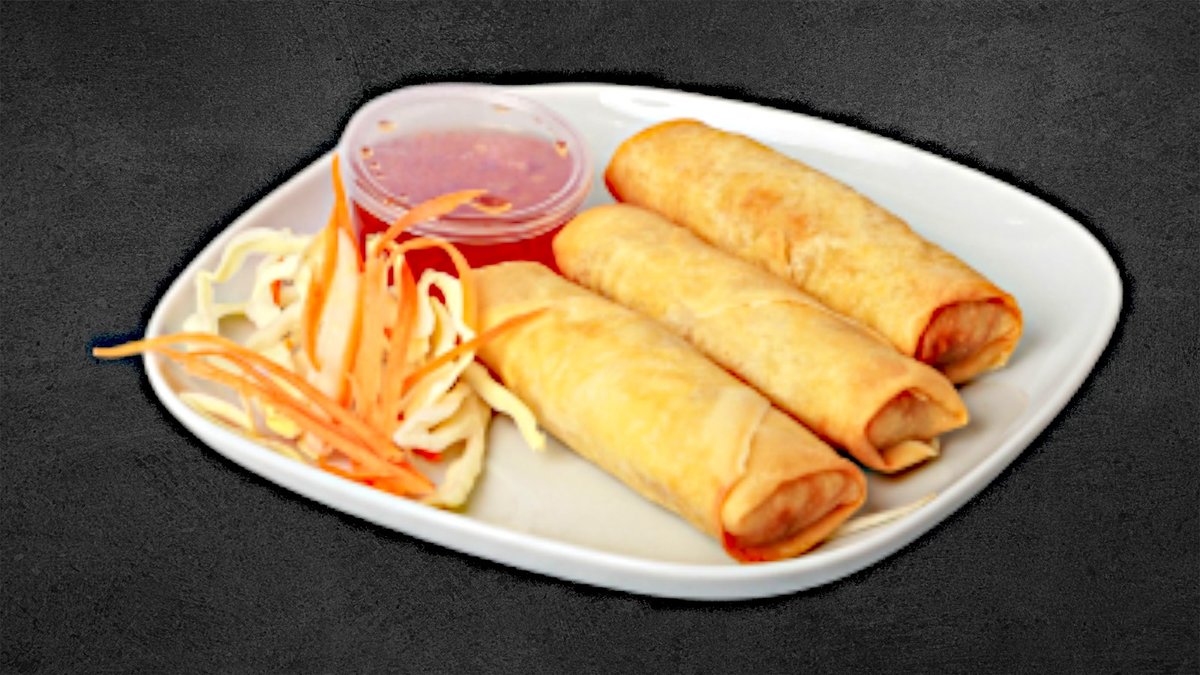 2 stk. hjemmelagde Sprøstekte vårruller fylt med kylling, servert med søt chilisaus.