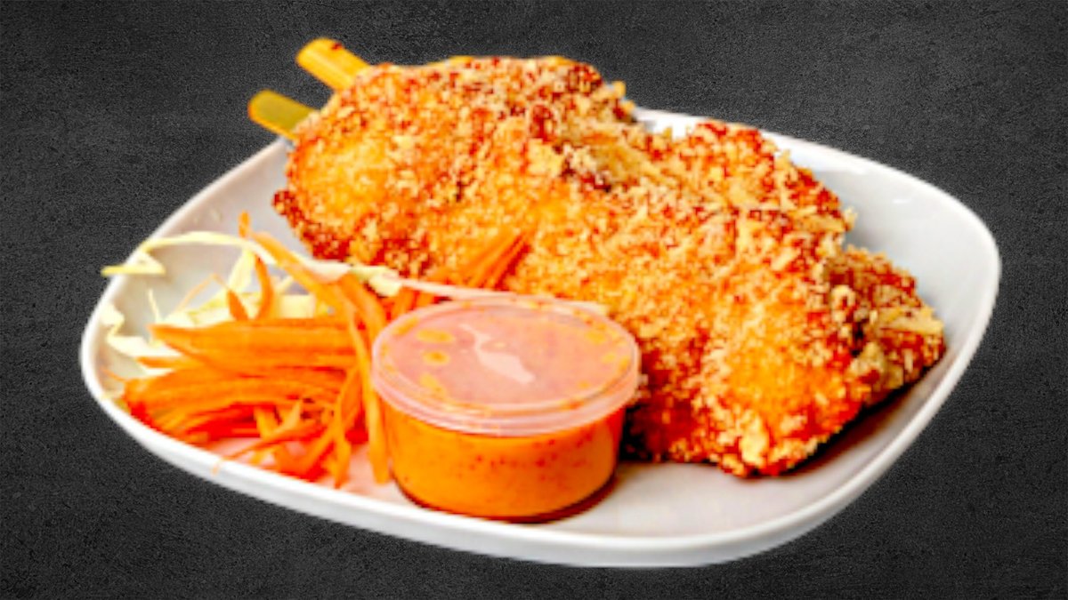 1 stk. Saftige kyllingspyd innbakt i sprø frityr, servert med peanøttsaus