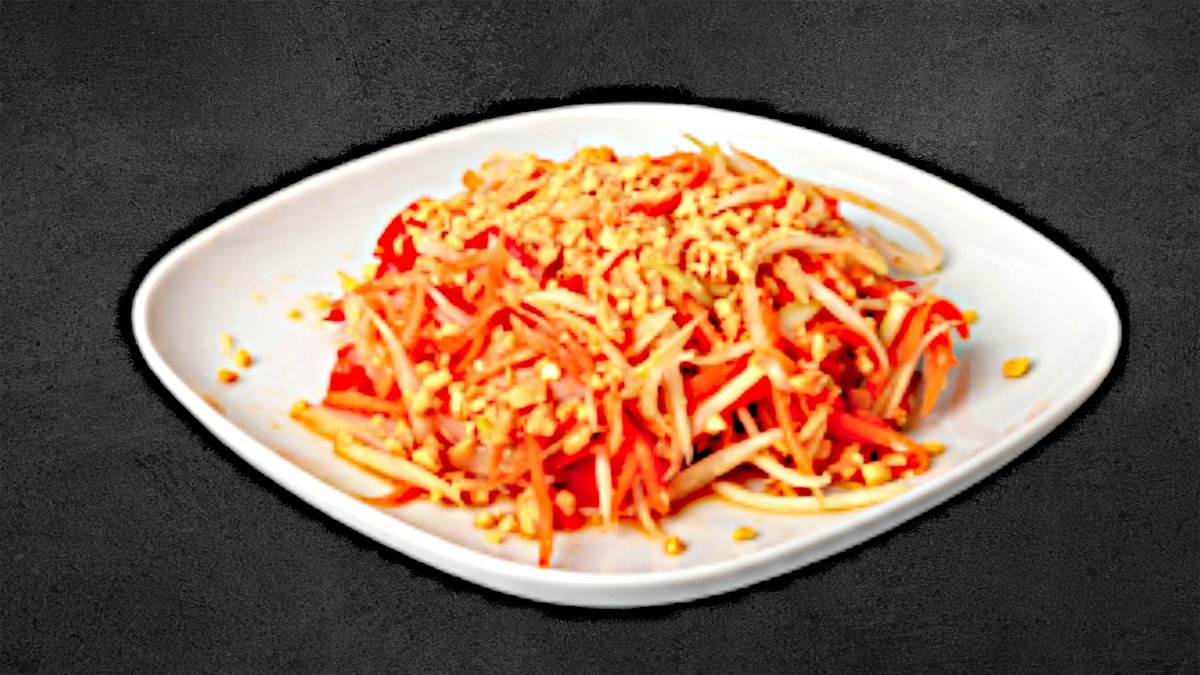 En kjent thailandsk papaya salat – frisk, spicy og sprø. Green papaya salad with chili, lime, fish sauce, garlic, tomato, and peanuts – a perfect balance of sweet, sour, salty and spicy.