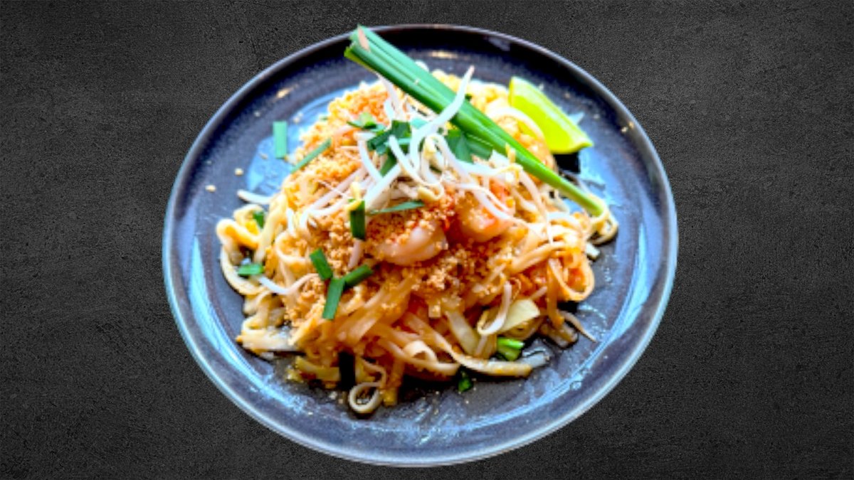 Klassiske thailandske risnudler stekt med egg, grønnsaker og peanøtter.