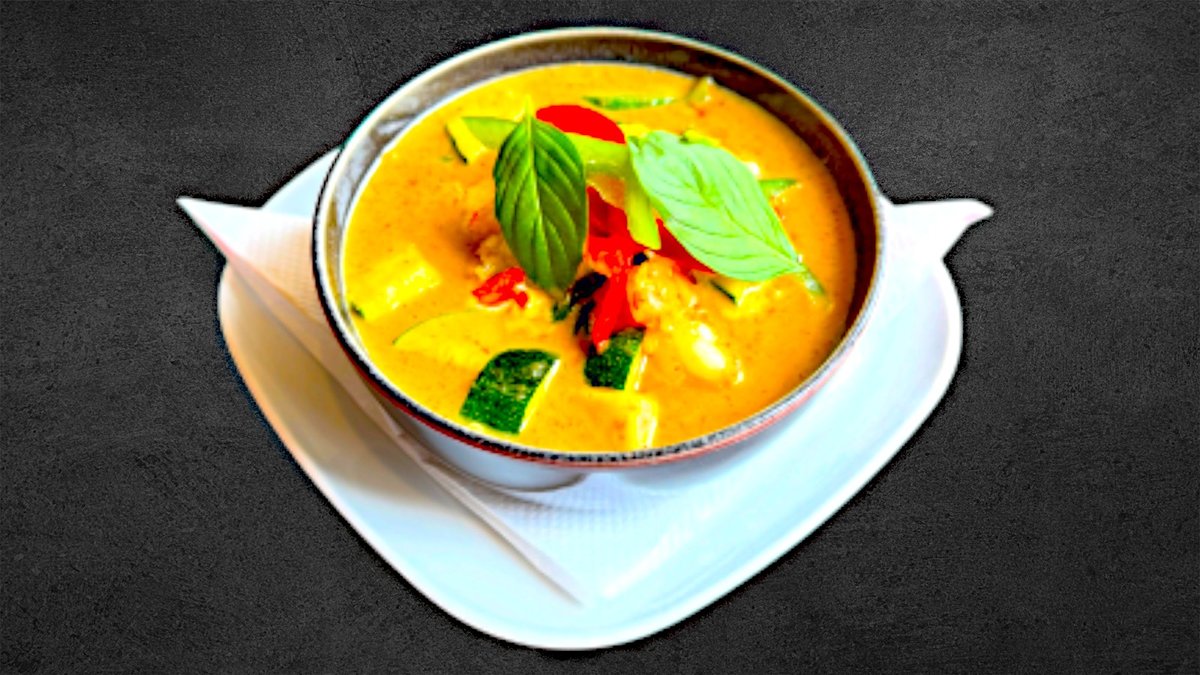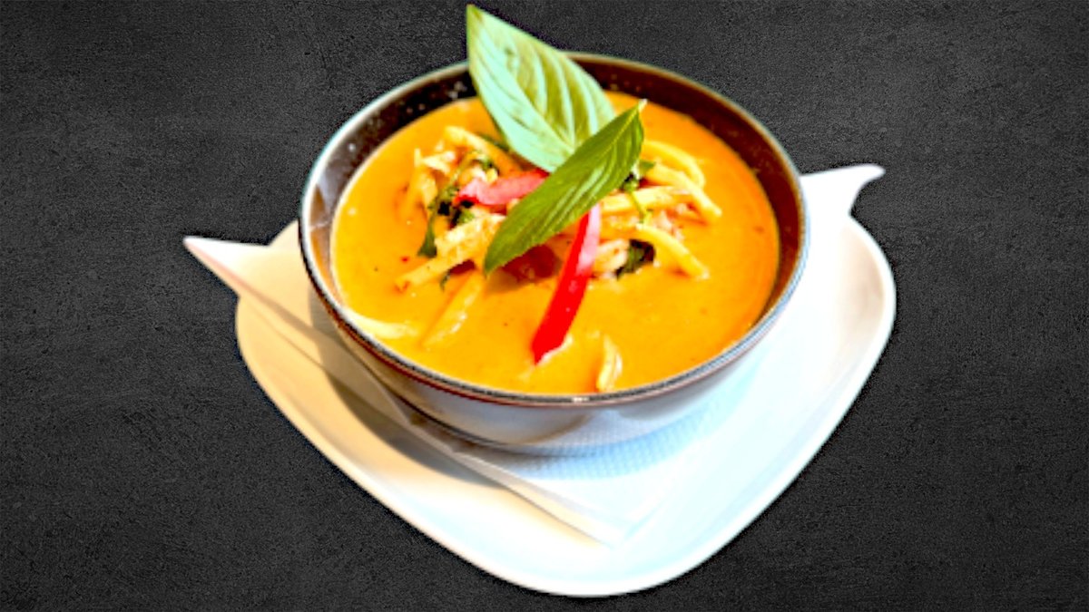 Kremet rød karri med kokosmelk, limeblad og valg av kjøtt eller tofu.