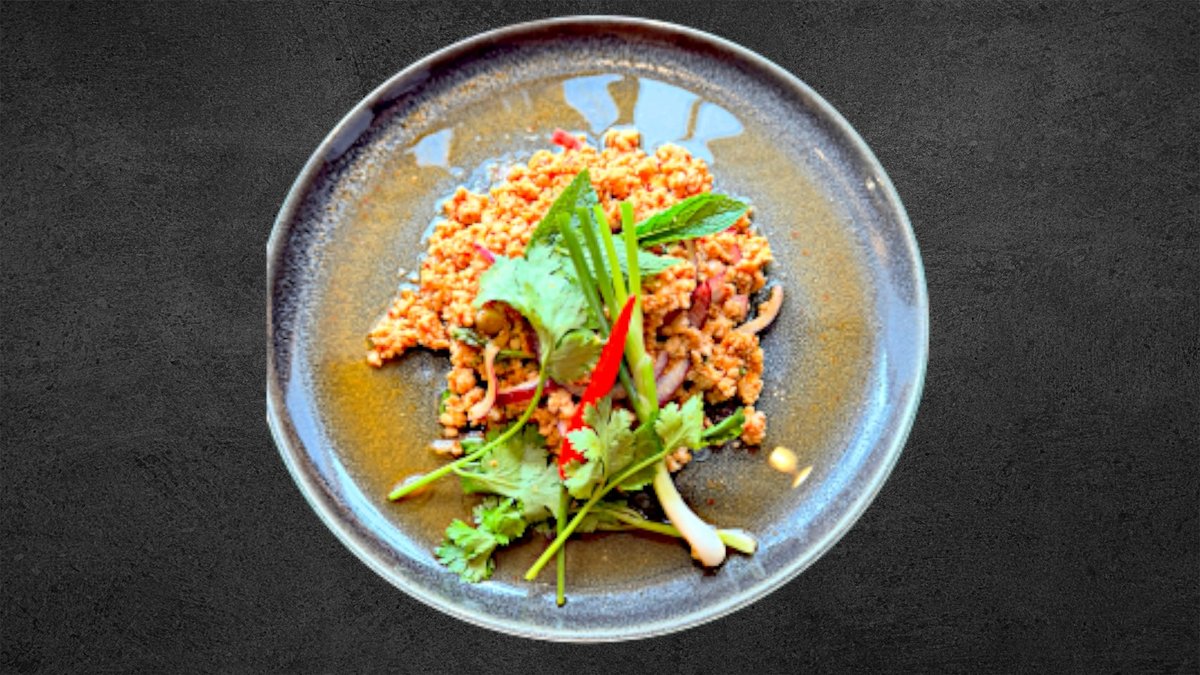 Sterk og frisk thaisalat med hakket kjøtt, lime, mynte, chili og rødløk – servert med ris.