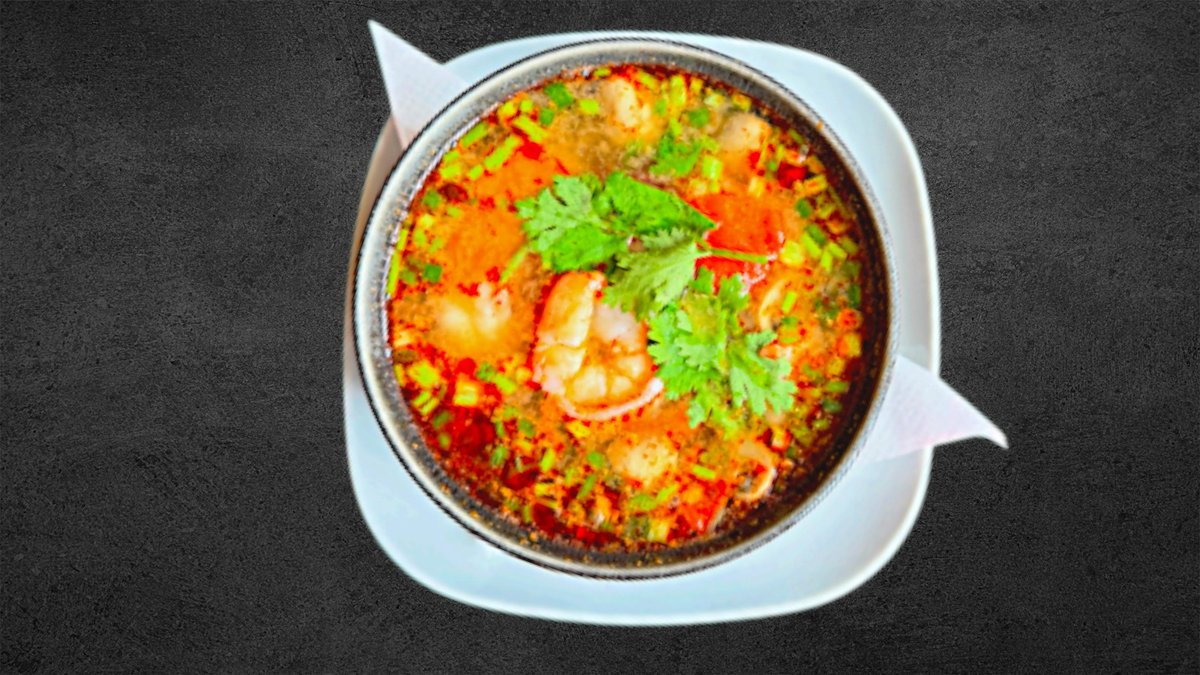 Klassisk thailandsk sur- og sterk suppe med sitrongress, limeblad, chili og sopp.