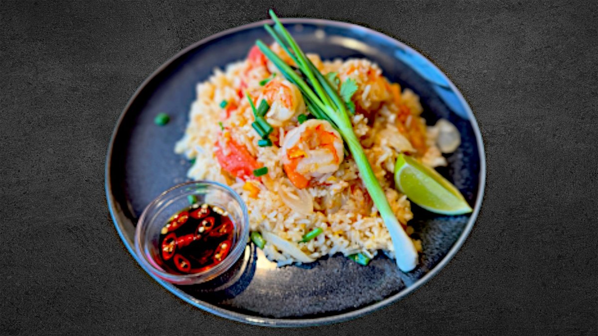 Stekt ris med egg, grønnsaker og valg av kylling, scampi eller tofu
